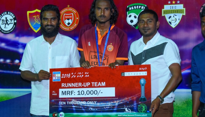 މުބާރާތުގެ ޗެމްޕިއަން ޓީމަށް ވާދައިގެ ތަށި ދެއްވީ ކުޅިވަރާ ބެހޭ ވަޒީރު އަޙުމަދު މަޚްފޫލެވެ.