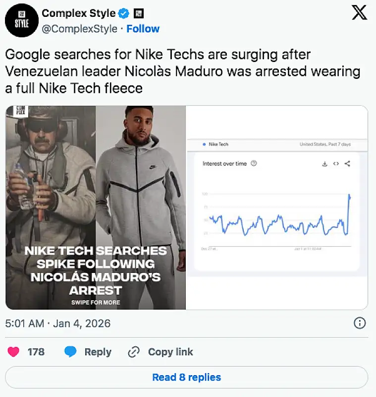 ޓްރަމްޕް އެ ފޮޓޯ ޝާއިއުކުރެއްވިތާ މަދު ދުވަސްކޮޅެއްގެ ތެރޭގައި ނައިކީ ޓެކްއަށް އޮންލައިން ސާޗްތައް އިތުރުވި އެވެ. އަދި އެ ޓްރެކްސޫޓުގެ އެކި ސައިޒުތައް ރާސްލާފައި ވިކެން ފެށި އެވެ. އެކަމަކު އެންމެ އަޖައިބުވާ ކަމަކީ މި ފޮޓޯ ވައިރަލް ވުމުގެ ކުރިން ނައިކީ ކުންފުނީގެ އެތެރޭގެ މީހުން ވެސް އެ ސްޓޮކް ގަންނަން ފަށާފައި އޮތުމެވެ.