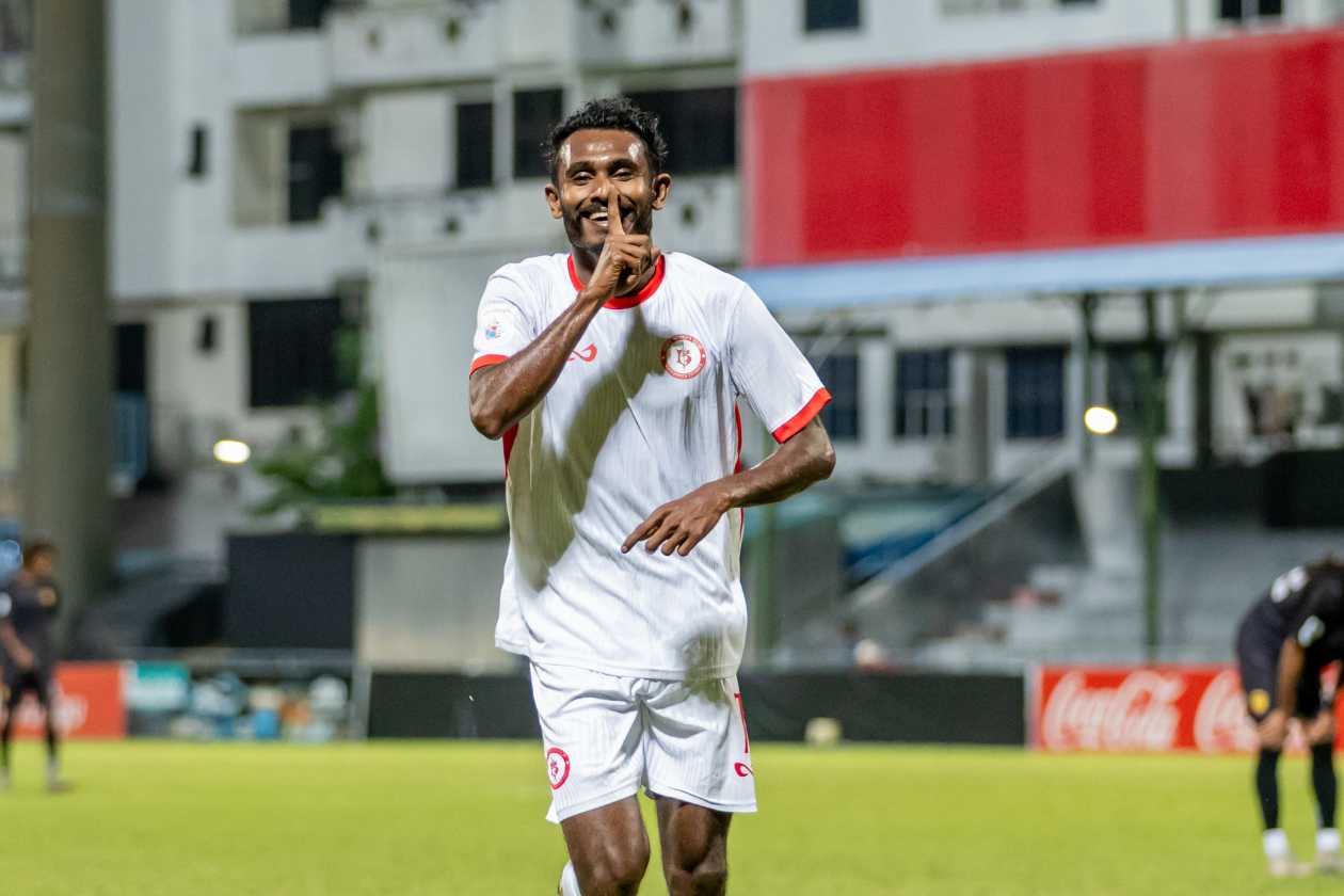 ބުރުގެ ނާއިމް، ޔުނައިޓެޑް ވިކްޓަރީ ކޮޅަށް ލަނޑު ޖެހުމަށް ފަހު އުފާފާޅުކުރަނީ.--- ފޮޓޯ: ރާއިފް ޔޫސުފް / އަދަދު ސްޕޯޓްސް