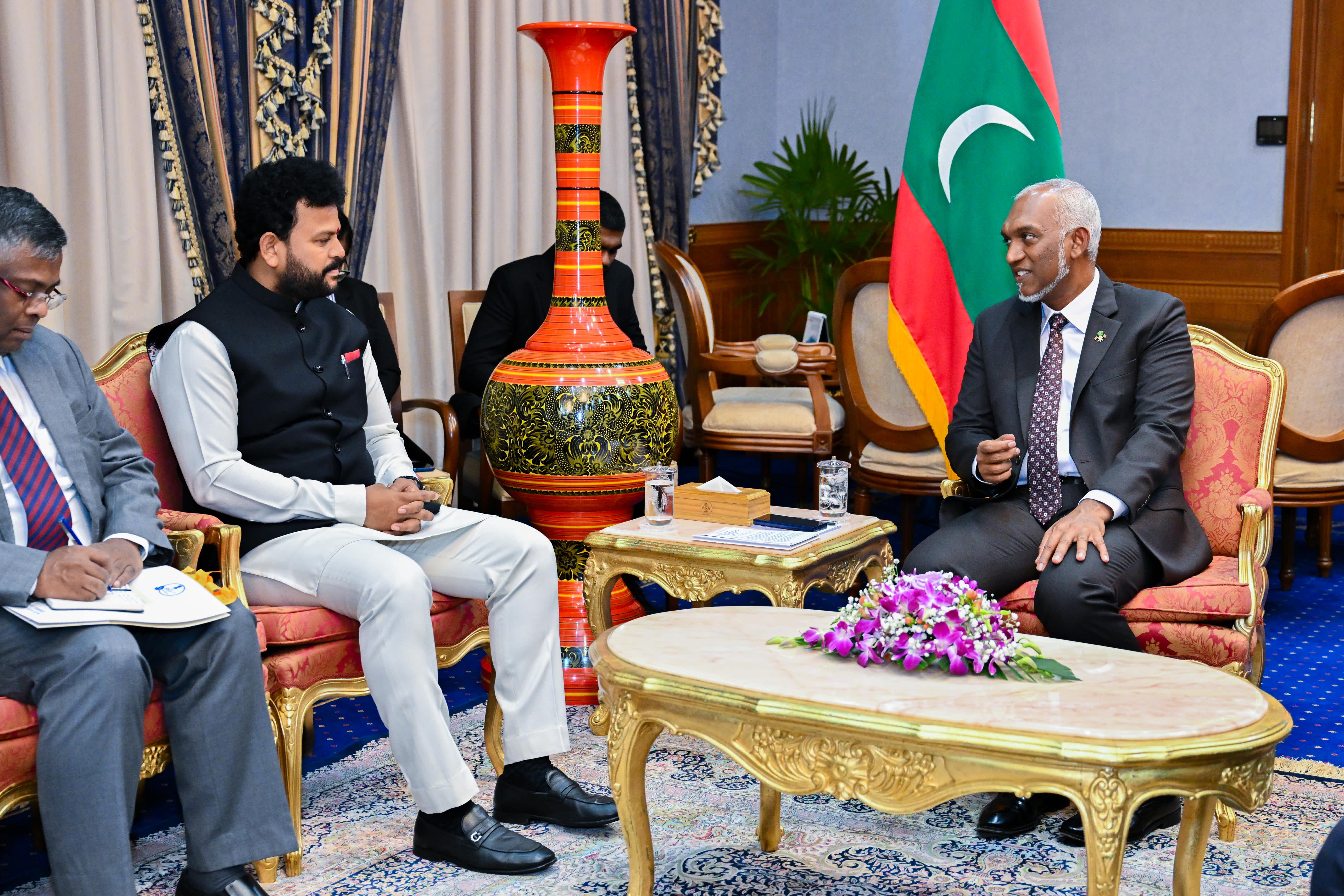 ހަނިމާދު އެއާޕޯޓު ހުޅުވަން މޯދީ ފޮނުއްވި މަންދޫބާއި މުއިއްޒު، ރައީސް އޮފީހުގައި ބައްދަލުކުރައްވަނީ ---- ފޮޓޯ: ރައީސް އޮފީސް