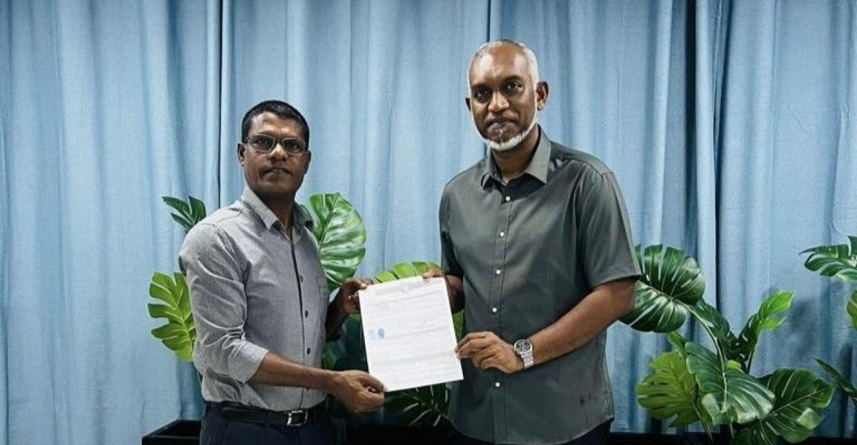 ހަސަންޓޭ ޕީއެންސީއަށް ސޮއިކުރެއްވި ފޯމާ ހަވާލުވެވަޑައިގަތީ ޕީއެންސީގެ ރައީސް އަދި ރައީސުލްޖުމްހޫރިއްޔާ ޑރ. މުހައްމަދު މުއިއްޒު އެވެ.