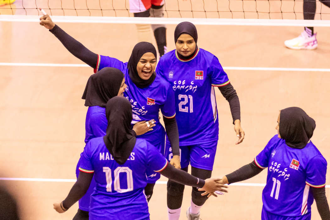 ގައުމީ އަންހެން ވޮލީބޯޅަ ޓީމުގެ ކުޅުންތެރިން މިރޭގެ މެޗުގެ ތެރެއިން އުފާފާޅުކުރަނީ.--- ފޮޓޯ: ރާއިފް ޔޫސުފް / އަދަދު ސްޕޯޓްސް