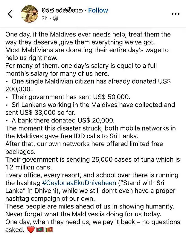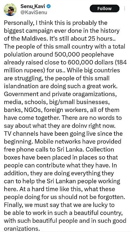 އޭނާގެ ސްޓޭޓަސްގައި ލިޔުނެވެ؛ އެންމެ ދިވެއްސެއް އެކަނި ވެސް ވެސް 200،000 ޑޮލަރު ހަދިޔާކޮށްފި އެވެ. އެ މީހުންގެ ގައުމުން 50،000 ޑޮލަރު ފޮނުވައިފި އެވެ. ރާއްޖޭގައި މަސައްކަތްކުރާ ސްރީ ލަންކާގެ މީހުން، 33،000 ޑޮލަރުު އެއްކޮށްފި އެވެ. އެތަނުގެ ބޭންކެއް 20،000 ޑޮލަރު ދީފި އެވެ. ސަރުކާރުން 25،000 މަސްދަޅު ފޮނުވަން ނިންމައިފި އެވެ.
