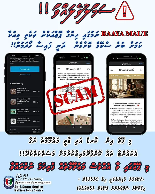 'ރާޔާ މާލެ'ގެ ނަމުގައި އޮންލައިންކޮށް ހިންގާ ޖުވެލަރީ ފިހާރައަކުން ހިންގާ ސްކޭމަކާ މެދު ސަމާލުވުމަށް ފުލުހުން އިލްތިމާސްކޮށްފި އެވެ.