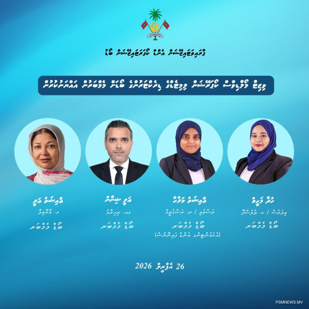ވިޒިޓް މޯލްޑިވްސް ކޯޕަރޭޝަން ބޯޑަށް އަލަށް އައްޔަންކުރެއްވި 4 މެމްބަރުންގެ ތެރޭގައި ހިމެނިވަޑައިގަންނަވަނީ 3 އަންހެން ބޭފުޅުންނާއި ފިރިހެން ބޭފުޅެކެވެ. މި ބޭފުޅުން ވީއެމްސީގެ ބޯޑަށް އައްޔަން ކުރައްވާފައިވަނީ، ކުރިން އެ ބޯޑުގައި ތިއްބެވި 3 މެންބަރުން ވަކިކުރެއްވުމަށްފަހުއެވެ. ވަކިކުރައްވާފައިވަނީ ޢަބްދުލް ސަމީޢު އިމާދުއާއި އާއިޝަތު ޙަމީދު އަދި ސަބީޙާ އަޙްމަދެވެ.