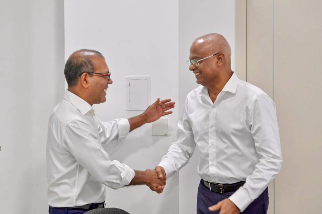 އެމްޑީޕީގެ މެންބަރުންގެ މެދުގައި އޮތް ދެ ރައީސުން އެކުގައި މަސައްކަތް ނުކުރުމުގެ ކަންބޮޑުވުމަށް ހައްލު ހޯދުމަށް ނަޝީދު އާއި ސޯލިހު ވަނީ މިއަދު އެމްޑީޕީގެ އޮފީހުގައި ބައްދަލުކުރައްވާފަ އެވެ. އެއަށް ފަހު ދެ ރައީސުން ވެސް ވަނީ އެކުގައި މަސައްކަތް ކުރާނެކަން އިއުލާންކޮށްފަ އެވެ.