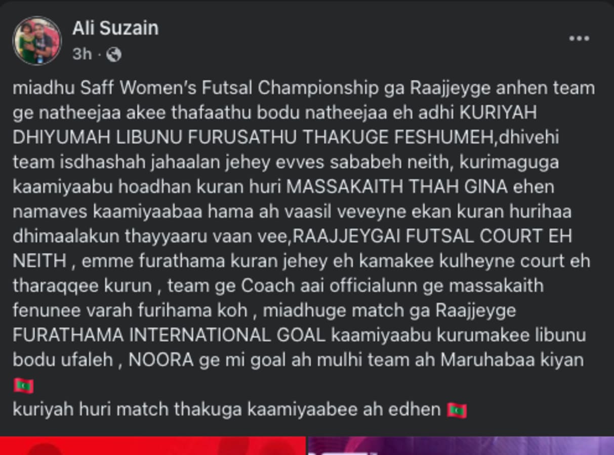 ރާއްޖޭގެ ގައުމީ އަންހެން ފުޓްސަލް ޓީމުން މުޅިން އަލަށް ބައިނަލްއަގުވާމީ މެޗެއްގައި ކުޅެ، ނެރުނު ނަތީޖާ އަކީ ކުރިއަށް ދިއުމަށް ހިތްވަރެއް ކަމަށާއި އެންމެ ފުރަތަމަ ރާއްޖޭގައި ކުރަން ޖެހޭ ކަމަކީ ފުޓްސަލް ކުޅޭނެ ތަނެއް ތަރައްގީ ކުރުން ކަމަށް މަޝްހޫރު ކޯޗު އަލީ ސުޒޭން ބުނެފި އެވެ.