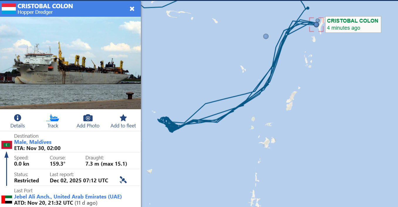ހޮލެންޑުގެ ހަން ޑެ ނަލް އިން އޮޕަރޭޓުކުރާ ކްރިސްޓޮބަލް ކޯލޮން ރާއްޖެ އައިކަން އިއުލާން ކުރެއްވީ ރައީސް މުހައްމަދު މުއިއްޒު އިއްޔެ އެކްސްގައި ކުރެއްވި ޕޯސްޓެއްގަ އެވެ. އެ ޑްރެޖަރު ރާއްޖެ އައީ ނޮވެމްބަރު 30، ގަ އެވެ. އަދި ފުށިދިއްގަރުފަޅު ހިއްކުމުގެ މަސައްކަތުގައި އެ ޑްރެޖަރުން އަމަލީ މަސައްކަތް ފެށީ އިއްޔެ އެވެ.