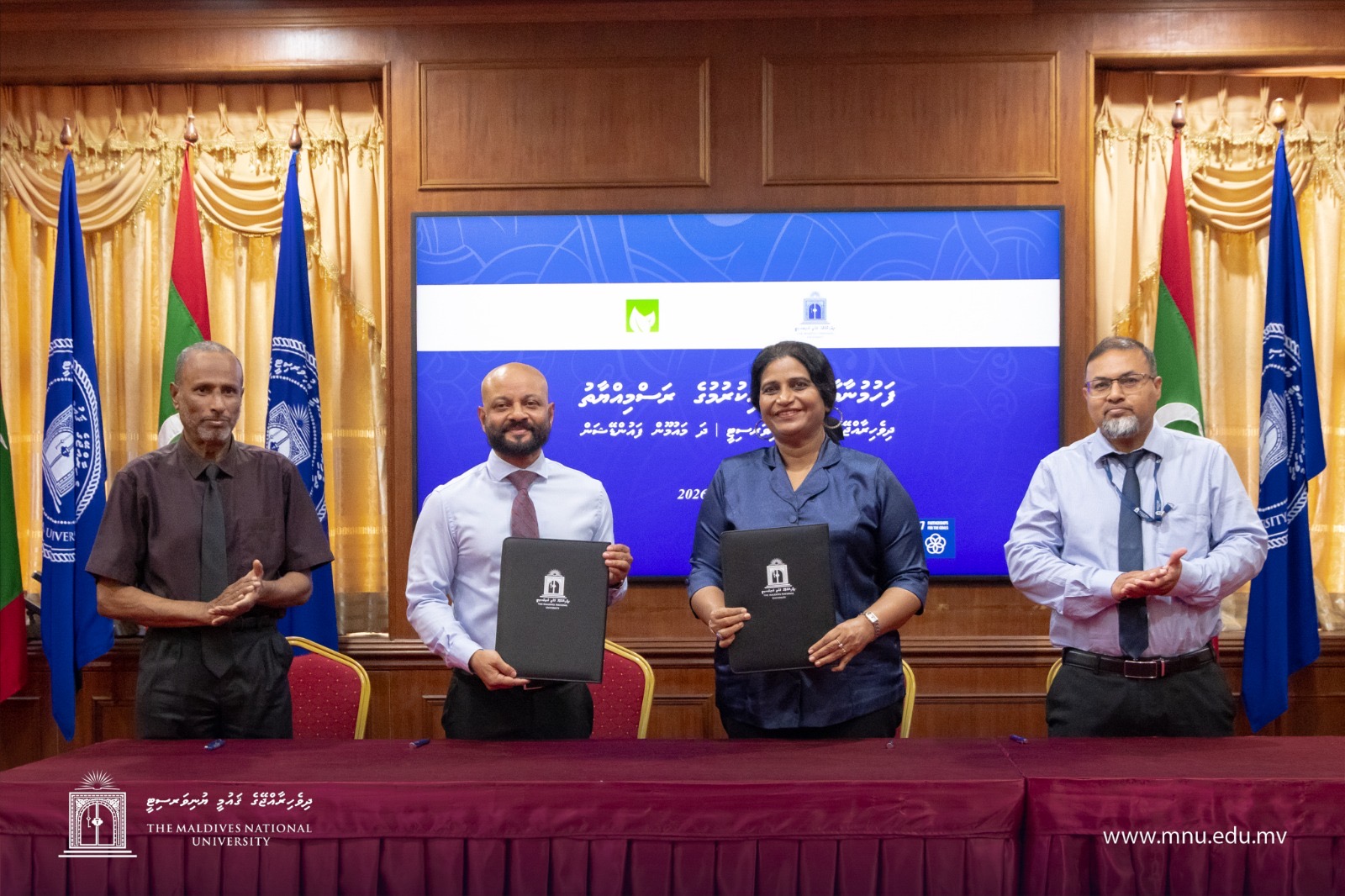 ދިވެހިރާއްޖޭގެ ޤައުމީ ޔުނިވަރސިޓީގައި ބޭއްވުނު ޚާއްޞަ ރަސްމިއްޔާތެއްގައި، މައުމޫން ފައުންޑޭޝަންގެ ފަރާތުން މި އެއްބަސްވުމުގައި ސޮއިކުރެއްވީ އެ ފައުންޑޭޝަންގެ ވައިސް ޗެއާމަން އަޙްމަދު ފާރިޝް މައުމޫން އެވެ. ޔުނިވަރސިޓީގެ ފަރާތުން ސޮއިކުރެއްވީ ވައިސް ޗާންސެލަރ ޑރ. ޢާއިޝަތު ޝެހެނާޒް އާދަމް އެވެ.