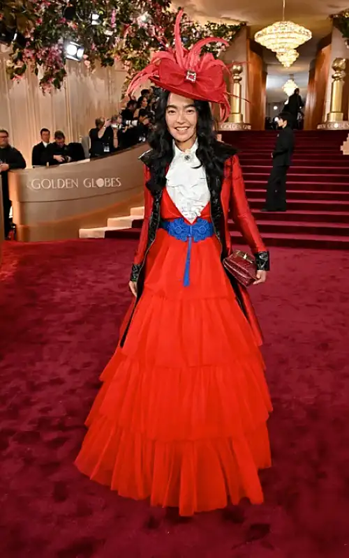 ރަތް ކުލައިގެ ބޮޑު ތޮތްޕަކާއި ޖެކެޓެއް އަދި ރަތް ކުލައިގެ ރޫ ނެގި ސްކާޓަކާ ގުޅުވާލައިފައި ހުރީ ގަދަ ނޫ ކުލައިގެ ބެލްޓެކެވެ. އޭނާ މި ހަފްލާއަށް ސްޓައިލް ކުރީ އަމިއްލައަށްތޯ ނޫނީ މިއީ ސްޓައިލިސްޓެއްގެ އެހީ ހޯދައިގެން ނެރުނު 'ލުކް'އެއްތޯ ސުވާލު ކުރެވުނެވެ. ސްޓައިލިސްޓެއްގެ އެހީ މި ހެދުމަށް ހޯދި ނަމަ، މިހާރުން މިހާރަށް އެ ސްޓައިލިސްޓު ވަޒީފާއިން ކަނޑާލުން ބުއްދިވެރި ކަމަށް ފެނެ އެވެ.