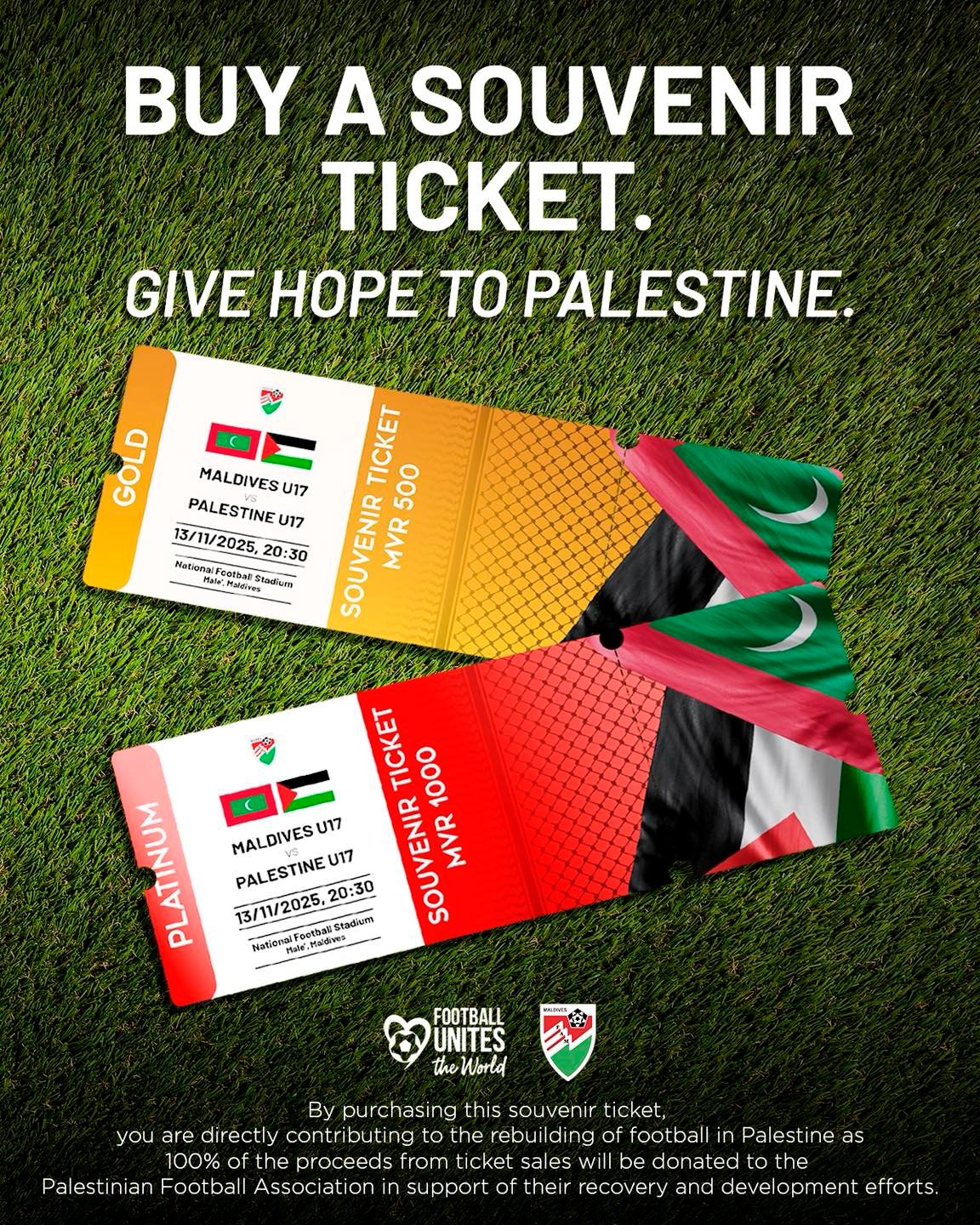 ބައިނަލްއަޤްވާމީ ރަހުމަތްތެރިކަމުގެ މެޗެއްގައި ދިވެހިރާއްޖެއާ ފަލަސްތީނުގެ ޒުވާން ޤައުމީތީމް ބައްދަލުކުރާ މެޗްގެ ޓިކެޓް ވިއްކަން ފަށައިފިއެވެ.