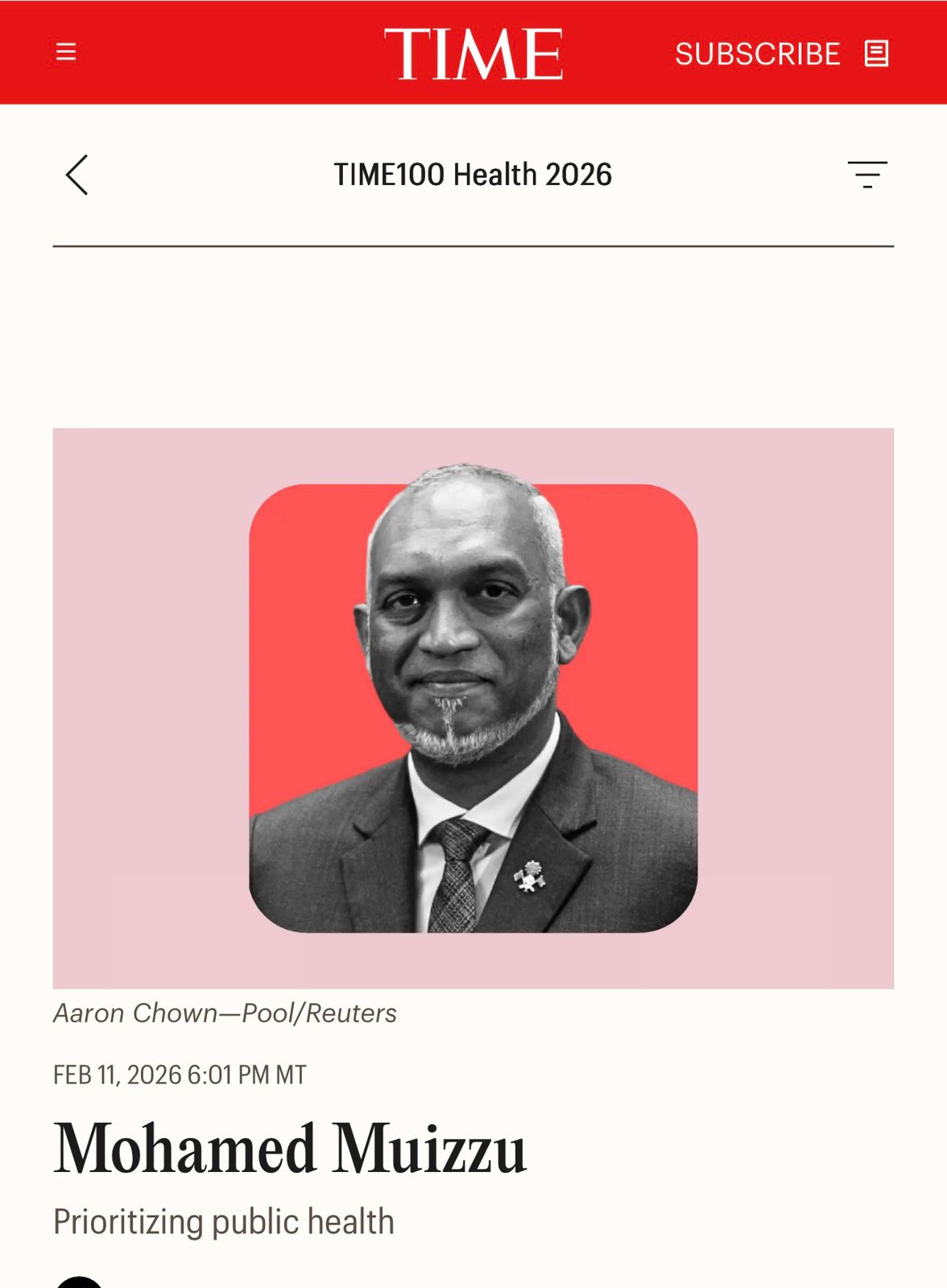 އެމެރިކާގެ މަޝްހޫރު ”ޓައިމް“ މެގަޒިންއިން ހޮވާ ސިއްހީ ދާއިރާގެ އެންމެ ނުފޫޒުގަދަ 100 ޝަހުސިއްޔަތުންގެ ތެރޭގައި ރައީސް ޑރ. މުހައްމަދު މުއިއްޒު ހިމެނިވަޑައިގެންފިއެވެ.