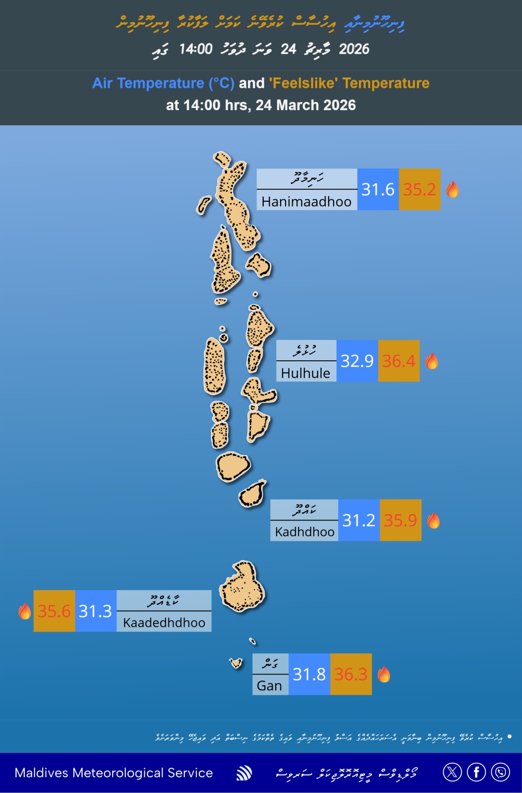 މޫސުމާ ބެހޭ ޤައުމީ އިދާރާއިން މިއަދު ނެރެފައިވާ މޫސުމާ ބެހޭ ރެކޯޑް ތަކަށް ބަލާއިރު، އެންމެ ހޫނު ގަދަކަމަށް ރެކޯޑްތަކުން ދައްކަނީ، މާލެ ސަރަހައްދާއި ހދ.ހަނިމާދޫ ހިސާބެވެ. މާލެ ސަރަހައްދުގެ އިހްސާސްކުރެވޭ ހޫނުމިން 36.8 ޑިގްރީ ސެލްސިއަސްގައި ހުރިއިރު، ރާއްޖޭގެ އެންމެ އުތުރުގައި އިހްސާސްކުރެވޭ ހޫނުމިން ހުރީ 35.6 ޑިގްރޫީ ސެލްސިއަސްގައެވެ. މީގެ އިތުރުން މެދުރާއްޖެ ތެރެއާއި އެހެނިގެން ސަރަހައްދުތައްވެސް ހުރީ 35 ޑިގްރީ ސެލްސިއަސްއަށްވުރެ މަތީގައެވެ.