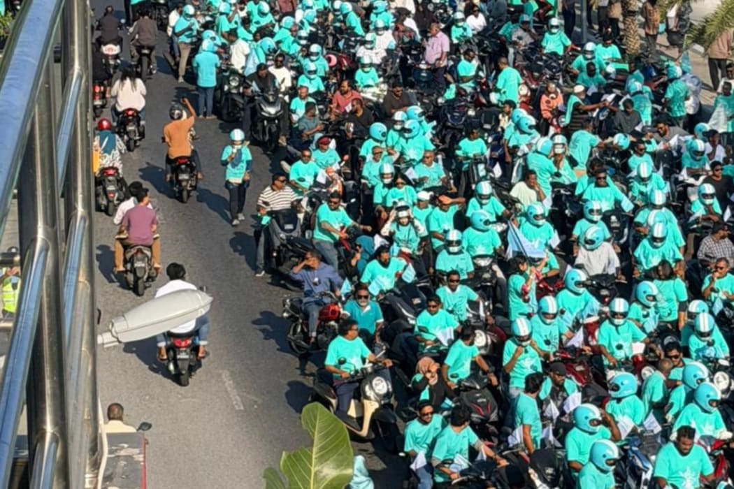 "އެންމެން އެކުވެރިވެ ދެ އިންތިހާބު އެކުގައި ބޭއްވުމަށް ނޫނެކޭ ބުނަން އިލްތިމާސްކުރަން. މުއިއްޒު އަމާޒު ހިފާފަ ހުރީ ގައުމު ފުނޑާލަވެސް ބާރުތައް ޖަމާކޮށް ވެރިކަމުގައި ދެމިހުންނަން!"