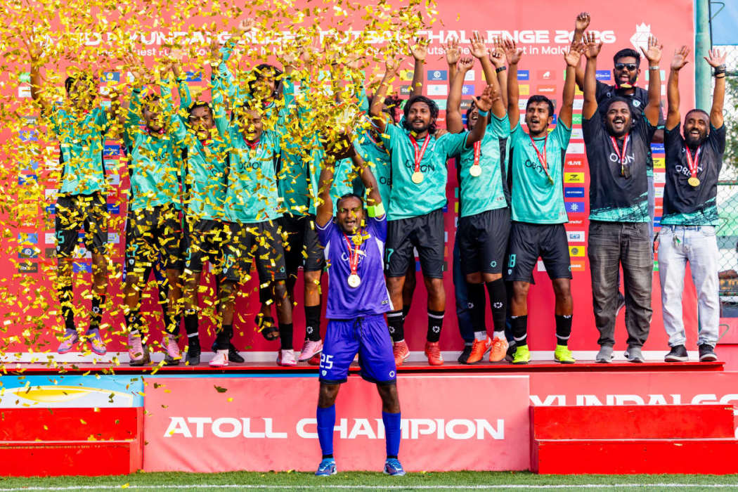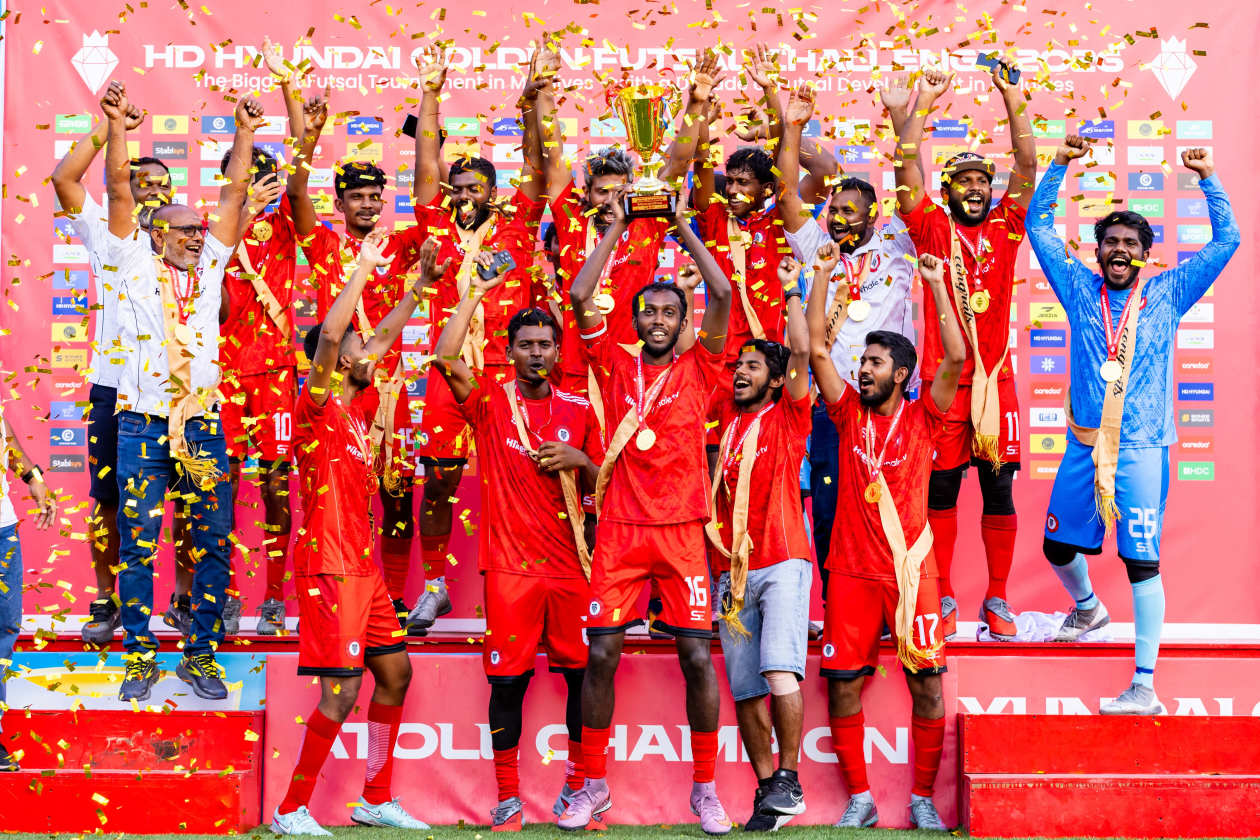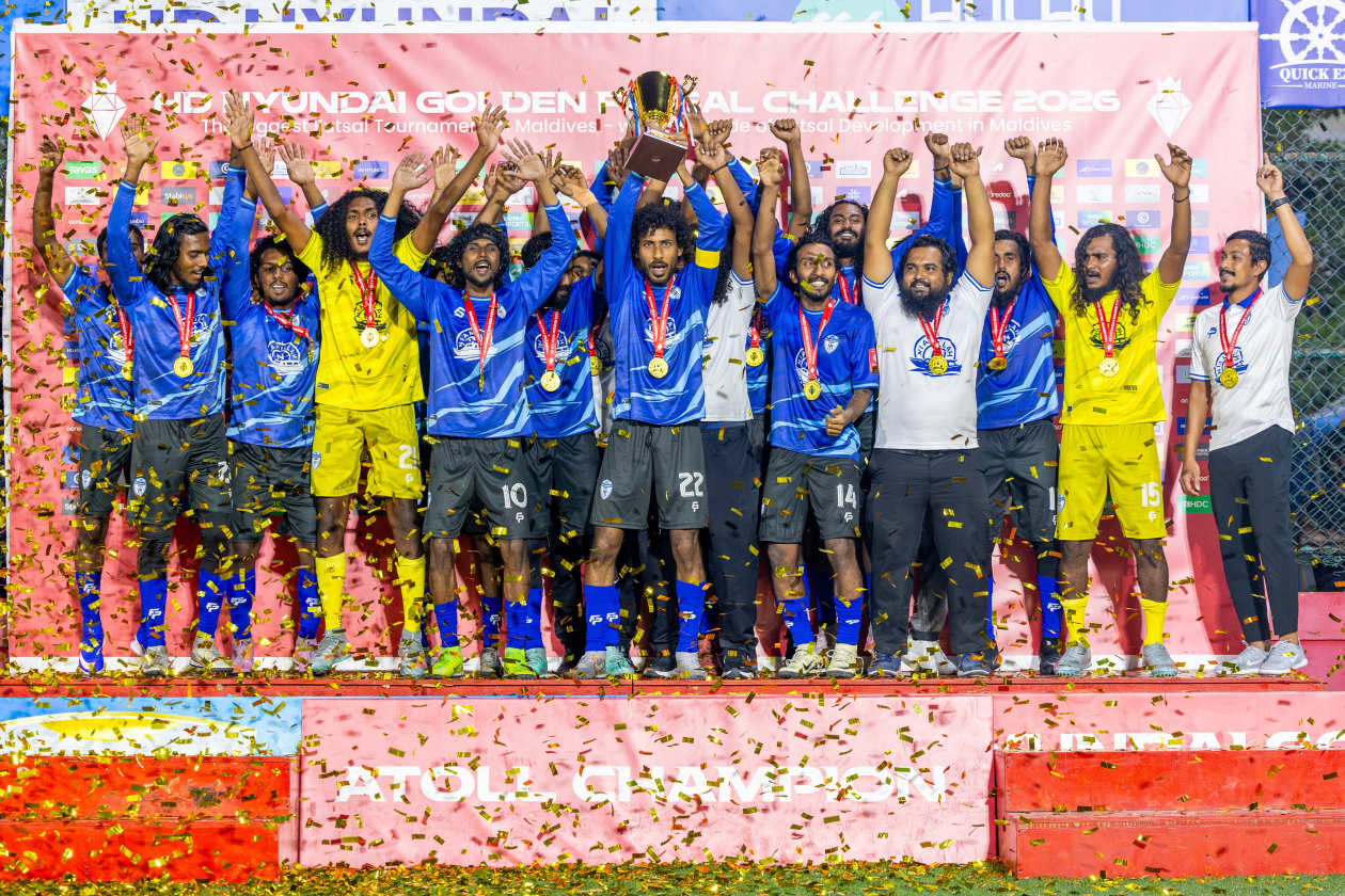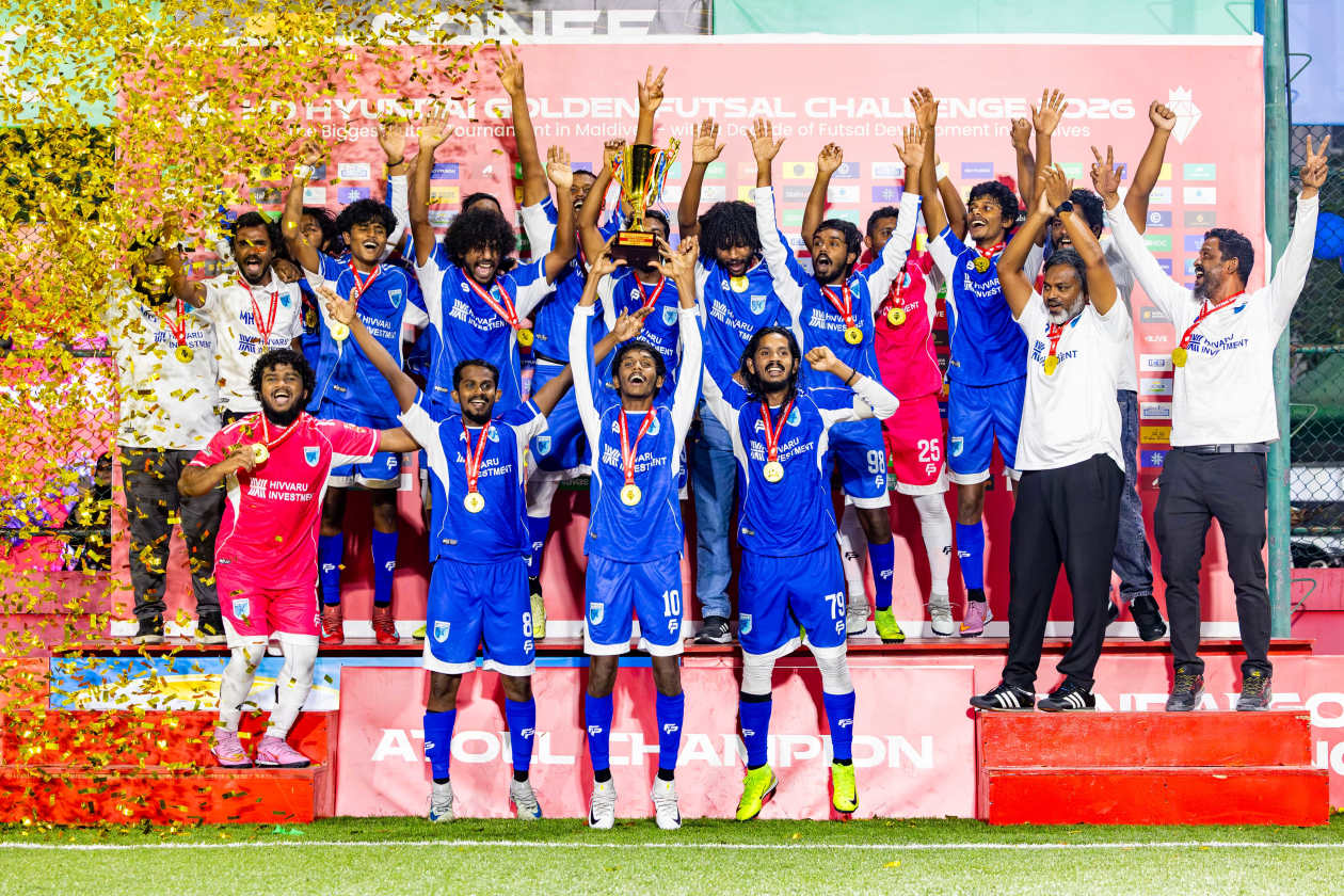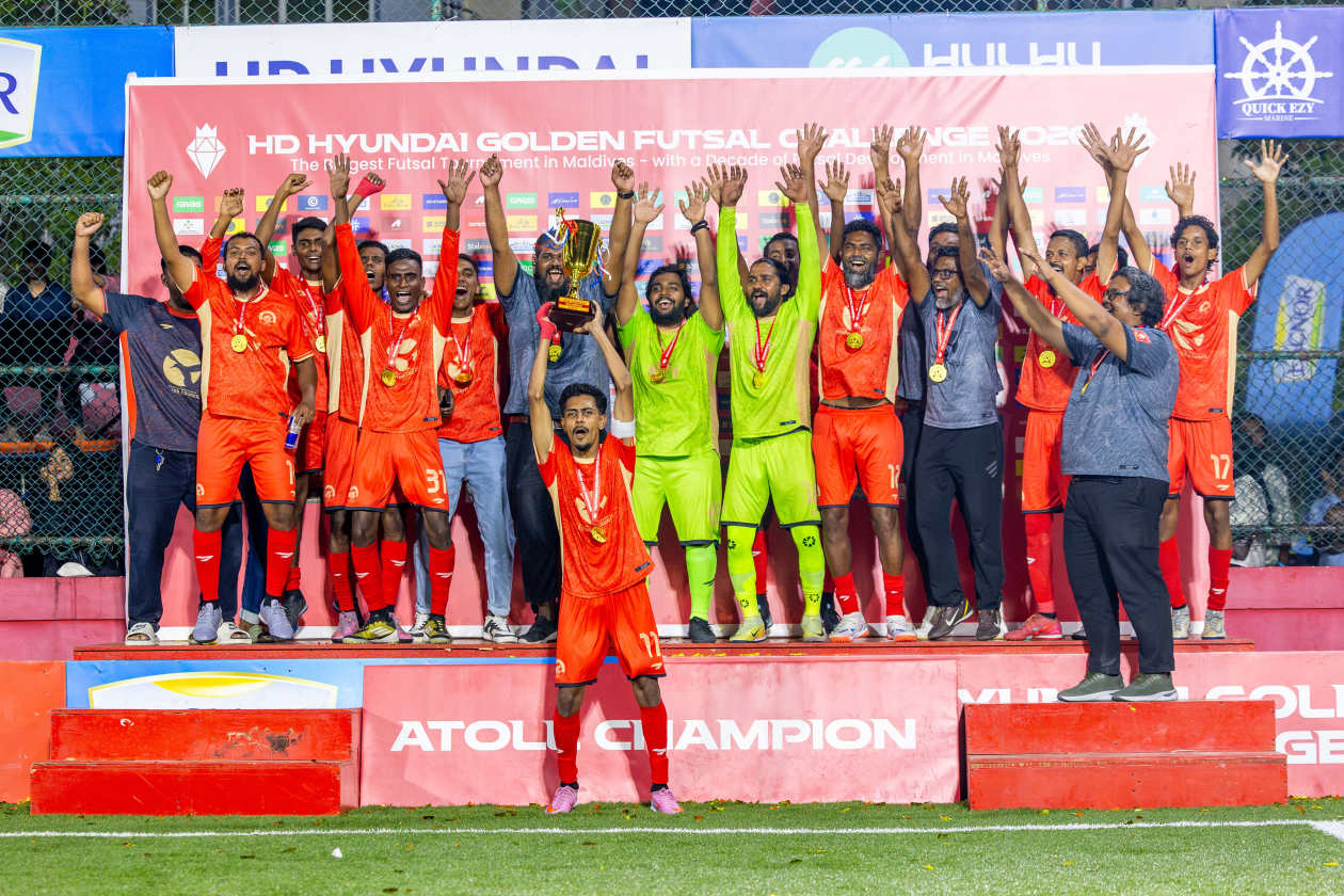 ހިއުންޑާއި ގޯލްޑަން ފުޓްސަލް ޗެލެންޖު 2026 ގައި އެންމެ ފަހުން ކުޅުނު އަތޮޅު ފައިނަލްތައް ކާމިޔާބުކޮށް، ރ. ދުވާފަރު، ހއ. މާރަންދޫ، އއ. މަތިވެރި، ނ. މާޅެންދޫ އަދި ވ. ކެޔޮދޫން ޗެމްޕިއަންކަން ހޯދައިފި އެވެ.