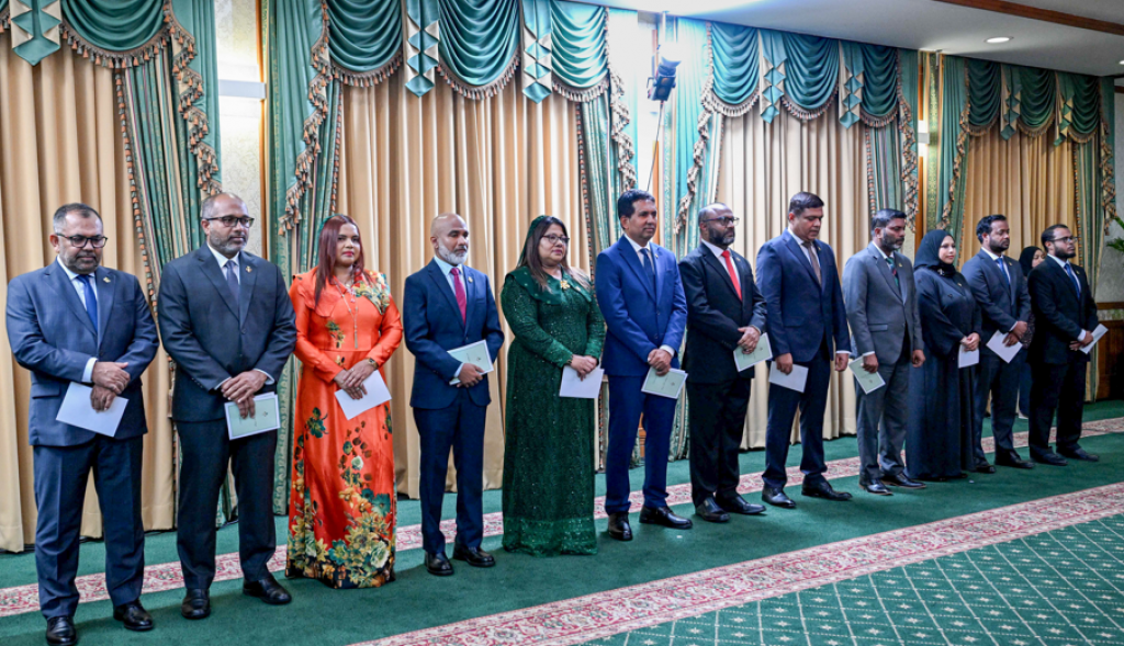 - ދިފާޢީ އަދި ވަތަނީ ހިދުމަތާ ބެހޭ ވަޒީރު ހަސަން ރަޝީދު- މާލީކަންކަމާއި ސަރުކާރު ކުންފުނިތަކާ ބެހޭ ވަޒީރު މޫސާ ޒަމީރު- ދާހިލީ ސަލާމަތާއި މަސައްކަތްތެރިކަމާއި ފަންނިއްޔާތާ ބެހޭ ވަޒީރު އަލީ އިހުސާން- ހާރިޖީ ވަޒީރު އިރުތިޝާމް އާދަމް- ތައުލީމާއި މަތީ ތަޢުލީމާއި ހުނަރުތައް ތަރައްޤީކުރުމާ ބެހޭ ވަޒީރު ޑރ. އިސްމާއީލް ޝަފީއު- ސިއްހަތާއި އާއިލާއާއި އިޖުތިމާއީ އެހީއާ ބެހޭ ވަޒީރު ގީލާ އަލީ- އިގުތިސާދީ ތަރައްގީއާއި ދަތުރުފަތުރާއި ވިޔަފާރިއާ ބެހޭ ވަޒީރު މުހައްމަދު ސައީދު- މަސްވެރިކަމާއި ދަނޑުވެރިކަމާއި ކަނޑުގެ ވަސީލަތްތަކާ ބެހޭ ވަޒީރު އަހްމަދު ޝިޔާމް- އިސްލާމީކަންތައްތަކާއި އައުގާފާ ބެހޭ ވަޒީރު ޑރ. މުޙައްމަދު ޝަހީމް އަލީ ސައީދު- ފަތުރުވެރިކަމާއި މަދަނީ އުދުހުންތަކާ ބެހޭ ވަޒީރު މުޙައްމަދު އަމީން- ޒުވާނުން ބާރުވެރިކުރުވުމާއި ކުޅިވަރާއި ހަށިހެޔޮކަމާ ބެހޭ ވަޒީރު އަބްދުﷲ ރާފިއު- ފަންނާއި ސަގާފަތާއި ތަރިކައާ ބެހޭ ވަޒީރު ހީނާ ވަލީދު- ބިނާރާއި ގެދޮރުވެރިކަމާއި އުމްރާނީ ތަރައްގީއާ ބެހޭ ވަޒީރު އަބްދުﷲ މުއްތަލިބް- މޫސުމީ ބަދަލުތަކާއި ތިމާވެއްޓާއި ހަކަތައާ ބެހޭ ވަޒީރު އަލީ ޝަރީފް
