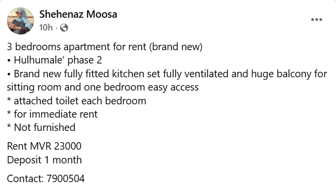 ޝެހޭ ސޯޝަލް މީޑިއާގައި ކުއްޔަށް ދިނުމަށް އިސްތިހާރު ޖަހާފައިވަނީ އަމާން ދޯދީގެ ޓަވަރެއްގެ އެޕާޓްމެންޓެކެވެ. މިއީ ކުއްޔަށް ދިނުން މަނާ އެޕާޓްމަންޓްތަކެއްކަމަށް ސަރުކާރުގެ އިތުރުން އެފްޑީސީންވެސް އަންނަނީ ކުރިންސުރެ ބުނަމުންނެވެ. ޝެހޭގެ ޕޯސްޓަށް ބަލާއިރު، އެ ޕޯސްޓްގައި ގުޅަންވީ ނަމްބަރެއްގެ ގޮތުގައި ޖަހާފައި ވަނީ އޭނާގެ އެކުވެރި އަދި ޓިކްޓޮކްގައި މަޝްހޫރު މަރިޔަމް ރުހުޝާ (ރޭޑިއޯ) ގެ ނަމްބަރެވެ.