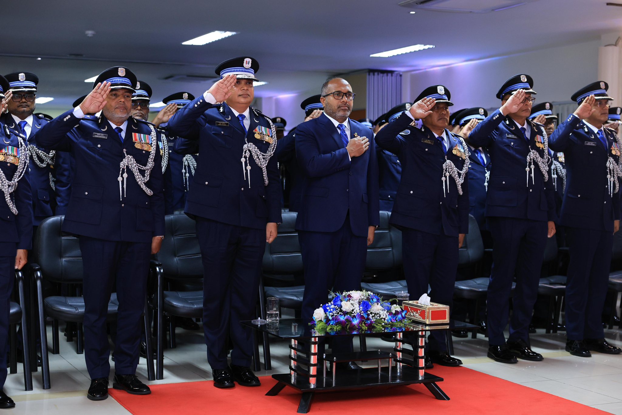 ފުލުހުންގެ އިސްވެރީން ބައިވެރިވެވަޑައިގެންނެވި މި ރަސްމިއްޔާތުގައި ކޮމިޝަނާ އޮފް ޕޮލިސް ރިޓަޔާޑް ނަވީންއަށް ޝަރަފުގެ ހަނދާނީ ފިލާ އަދި ރިޓަޔާމަންޓް ކާޑު އަރުވާފައިވެ އެވެ. ޝަރަފުގެ ހަނދާނީ ފިލައަކީ، ޝަރަފުވެރިކަމާ އެކު ރިޓަޔާ ކުރައްވާ ކޮމިޝަނަރުންނަށް ދިވެހި ފުލުހުންގެ ހިދުމަތުގެ ފަރާތުން އަރުވާ ފިލައެކެވެ. މި ހަނދާނީ ފިލާގައި ހިމެނެނީ ކޮމިޝަނާ އަށް ލިބިވަޑައިގެންފައިވާ ކުލަތަކާއި، މެޑަލްތައް އަދި ކޮމިޝަނާ އޮފް ޕޮލިސްގެ ޔުނިފޯމުގައި ހިމެނޭ އައިޓަމްތަކުގެ އިތުރުން ފުލުހެއްކަން އަންގައިދޭ ކާޑެވެ.
