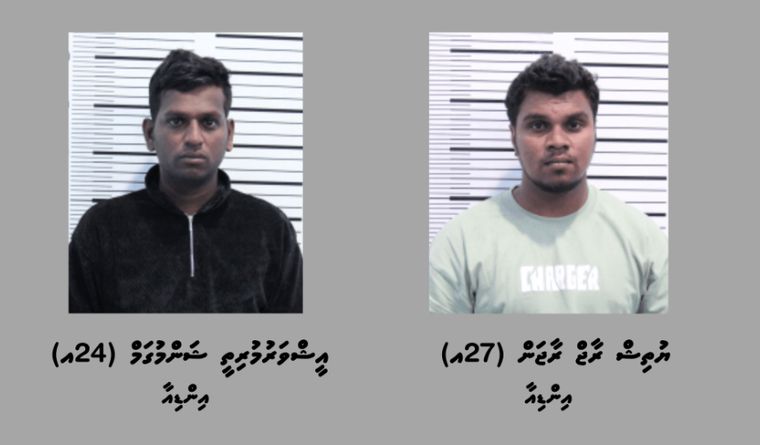 ފުލުހުން ބުނީ މި މައްސަލައާ ގުޅިގެން ހައްޔަރުކޮށްފައިވަނީ އިންޑިއާއަށް ނިސްބަތްވާ ދެމީހުން ކަމުގައިވާ ޔުތިޝް ރާޖް ރާޖަން (27އ) އާއި އީޝްވަރުމުރިތީ ޝަންމުގަމް (24އ) ކަމަށެވެ. އިތުރަށް ފުލުހުން ބުނީ މާޗު 20 ވަނަ ދުވަހު ހައްޔަރުކުރި މި ދެމީހުންނަކީ ހަ ކިލޯ އަށްވުރެ ގިނަ މަސްތުވާތަކެތި ރާއްޖެ އެތެރެކުރިކަމުގެ ތުހުމަތުގައި މޯލްޑިވްސް ކަސްޓަމްސް ސަރވިސްއިން ފުލުހުންނާ ހަވާލުކުރި ދެ މީހުން ކަމަށެވެ.