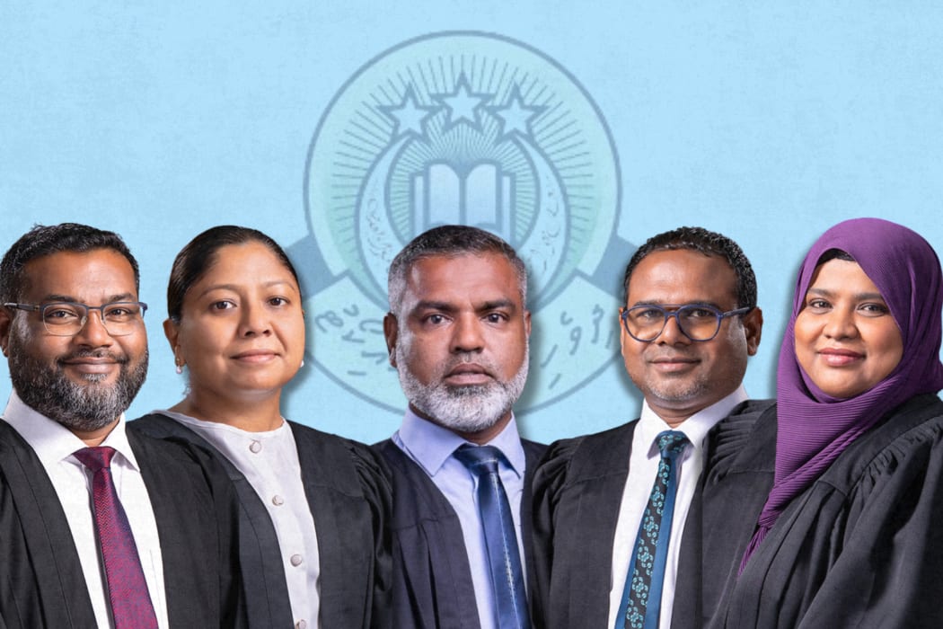 ސުޕްރީމް ކޯޓުގެ ބެންޗުގައި ހަތް ފަނޑިޔާރުން ތިއްބަވަ އެވެ. އޭގެ ތެރެއިން ހަތަރުު ފަނޑިޔާރުން އައްޔަނު ކުރެއްވީ މުއިއްޒު އެވެ.