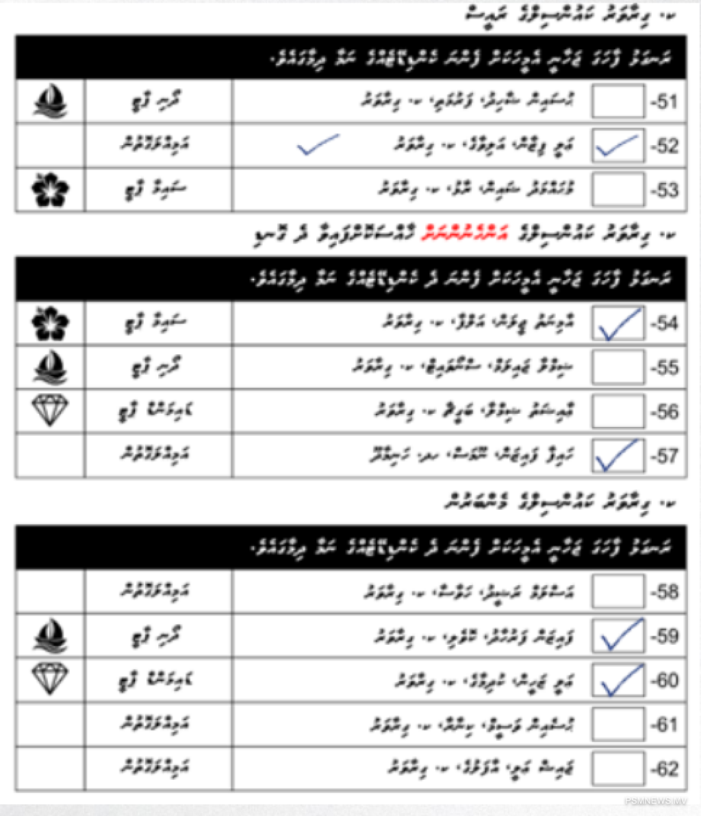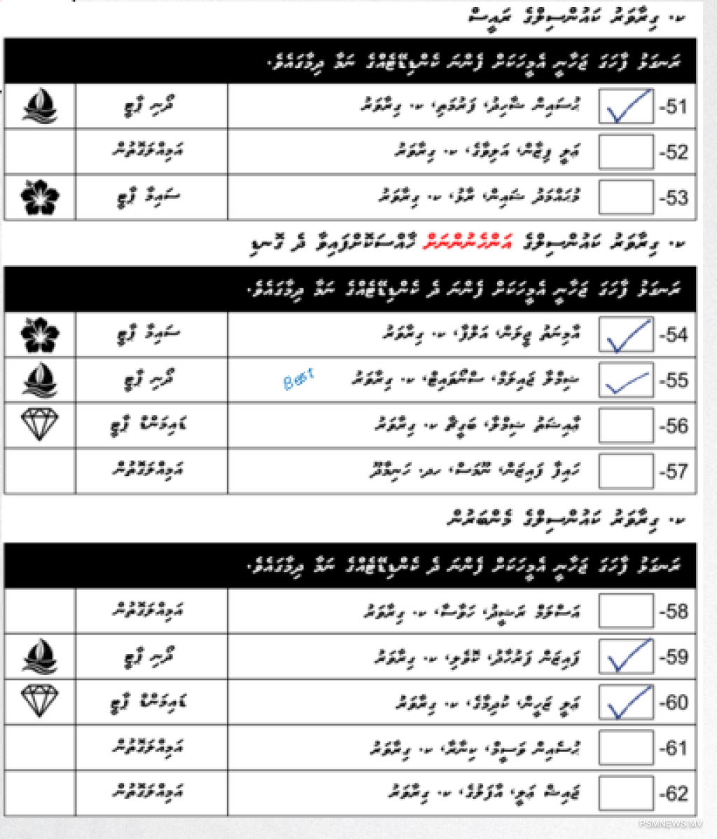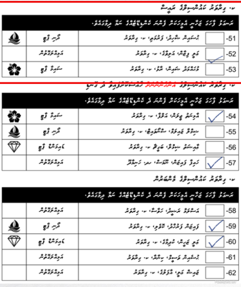 • ވޯޓު ކަރުދާހުގައި އެއްވެސް ކެންޑިޑޭޓެއްގެ ނަމާ ދިމާލުގައި ފާހަގަޖަހާފައި ނުވާ ވޯޓު