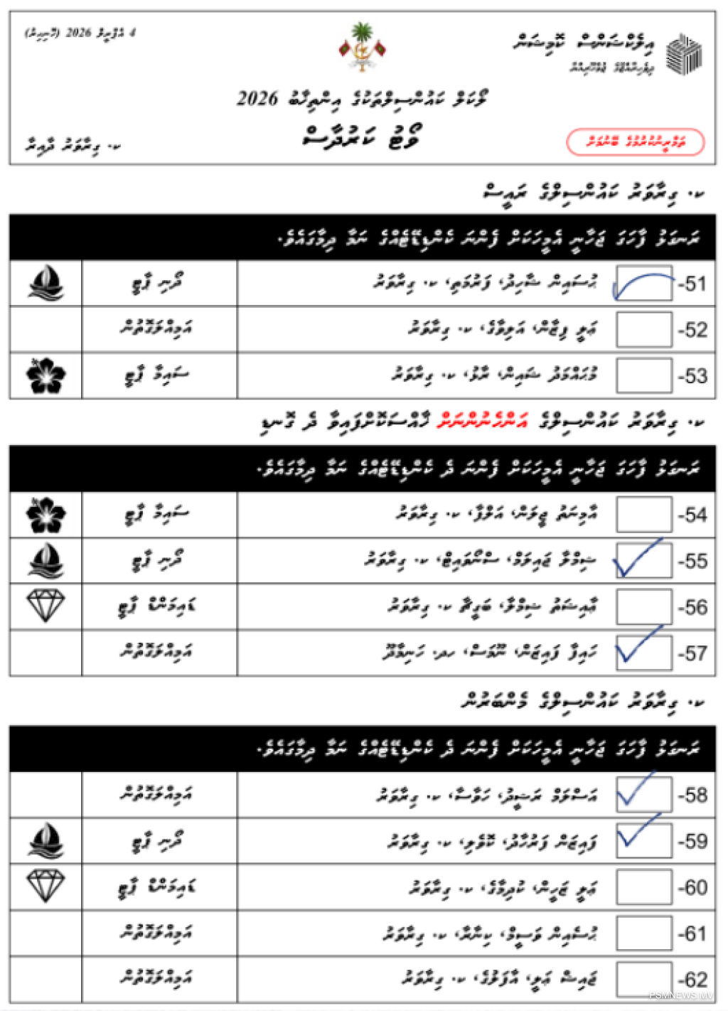 ކައުންސިލާއި އަންހެނުންގެ ކޮމިޓީގެ އިންތިޚާބު އަދި ރައްޔިތުންގެ ޚިޔާލު ހޯދުމުގެ އާންމު ވޯޓުގައި 3 ވޯޓު ކަރުދާހެއް ލިބޭއިރު ކޮންމެ ކަރުދާހެއްގައިވެސް ފާހަގަޖަހަންވާނީ އެ ކަރުދާހެއްގައި ފާހަގަޖަހަން އިރުޝާދު ދީފައި އޮންނަ އަދަދަށެވެ. އެހެންކަމުން އަތަށް ކަރުދާސް ލިބުމުން ކޮންމެ މީހަކުވެސް އެ ކަރުދާހުގައިވާ އިރުޝާދު ރަނގަޅަށް ކިޔުމަކީ މުހިންމު ކަމެކެވެ.