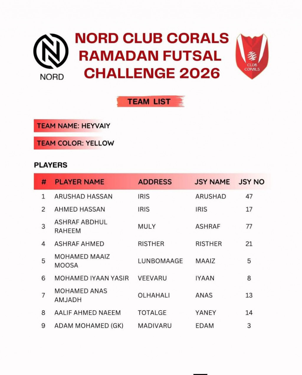 ކުލަބް ކޮރަލްސްއިން އިންތިޒާމުކޮށް ކޮންމެ އަހަރަކު ބާއްވަމުން އަންނަ 'ނޯޑް ކުލަބް ކޮރަލްސް ރަމަޟާން ފުޓްސަލް ޗެލެންޖު 2026' ފެށުމަށް ތައްޔާރުވެއްޖެ އެވެ.