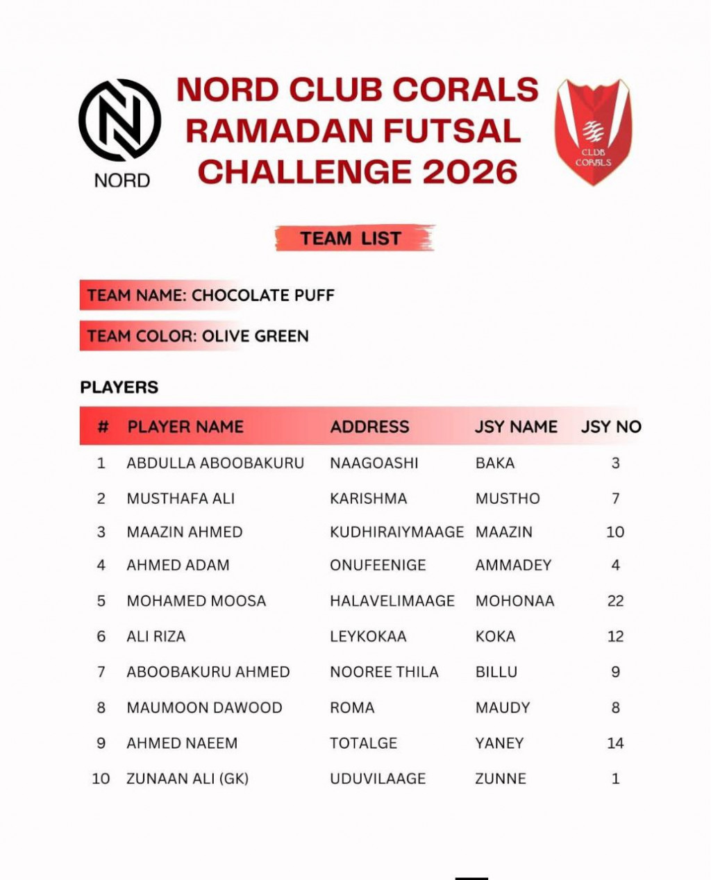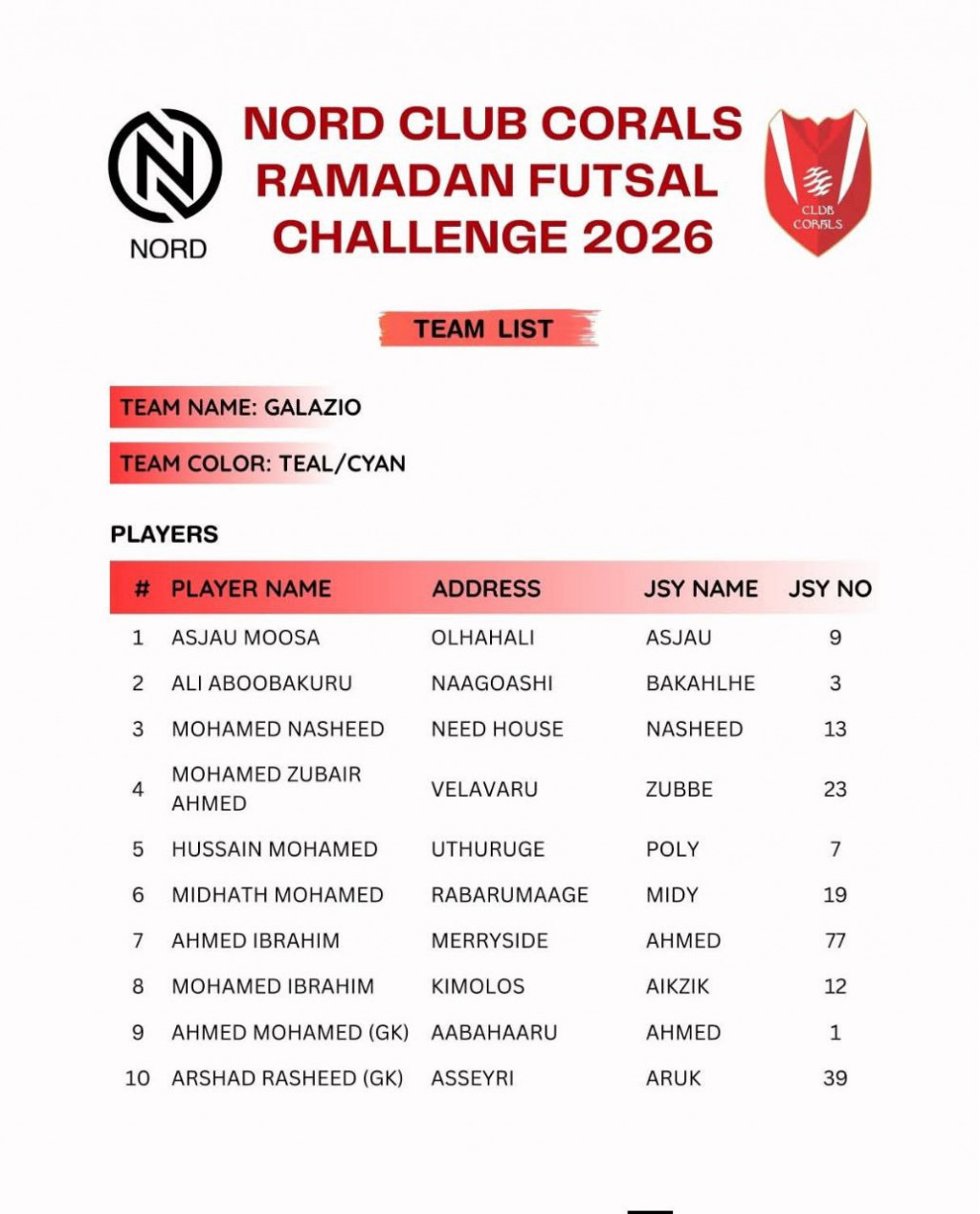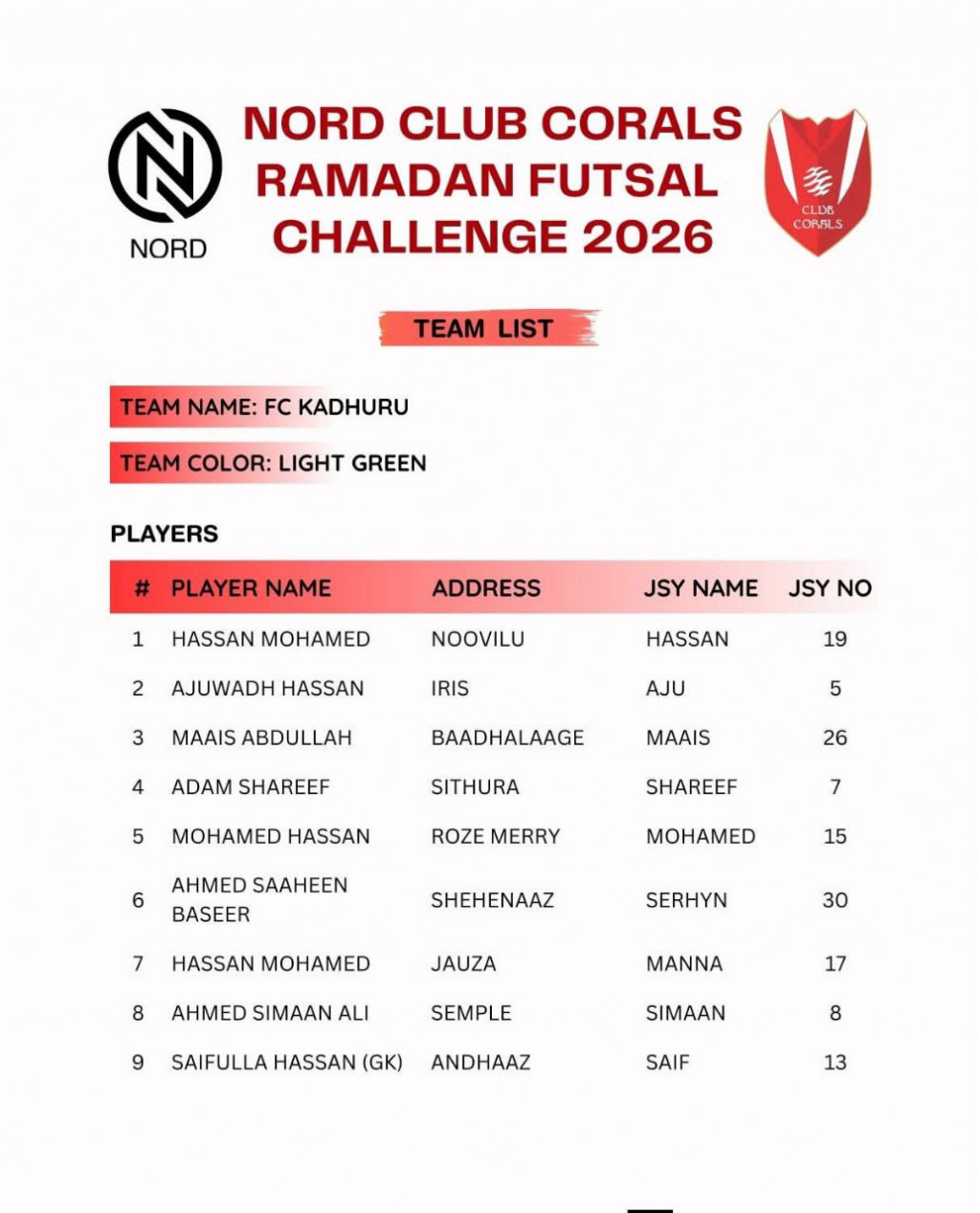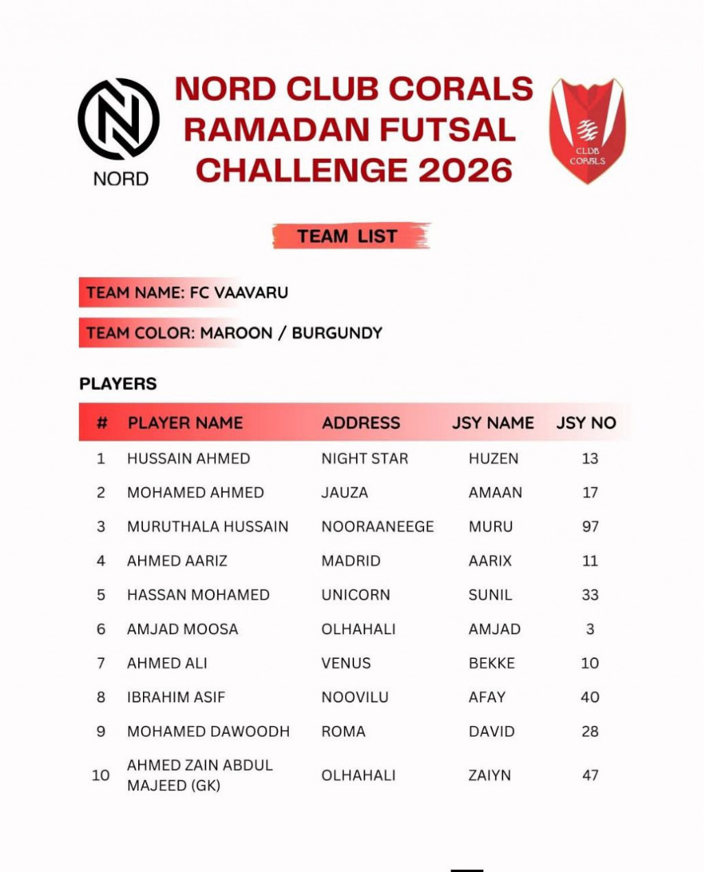 މިއަހަރުގެ މުބާރާތުގައި ވާދަކުރާ ޓީމުތަކުގެ ޓީމް ލިސްޓް--- ފޮޓޯ: ކުލަބް ކޮރަލްސް