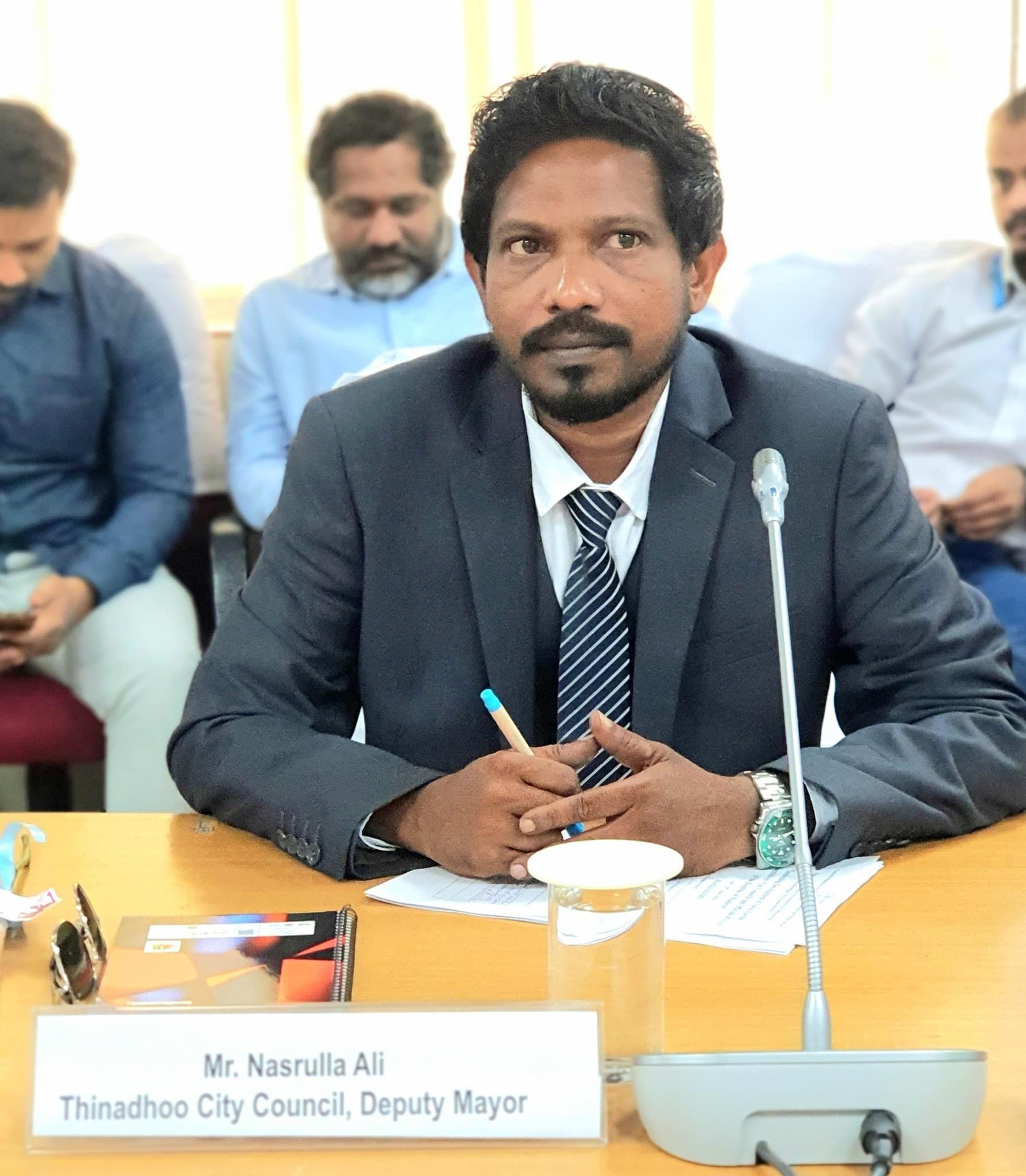 ތިނަދޫ ސިޓީގެ ޑެޕިއުޓީ މޭޔަރު ނަސްރުﷲ ޢަލީގެ ދާއިރާ ތަމްސީލްކުރައްވަނީ ރައްޔިތުންގެ މަޖިލީހުގެ ތިނަދޫ އުތުރު ދާއިރާގެ މެންބަރު ސައުދުالله ހިލްމީއެވެ.