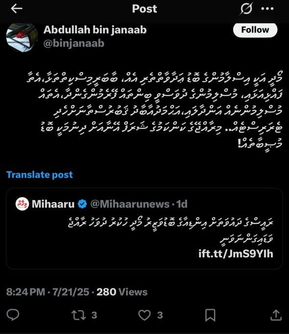 ނަމަވެސް އަބްދުﷲ ގެ ޕޯސްޓު އޭނާ ވަނީ މިހާރު ޑިލީޓުކޮށްލައިފަ އެވެ. ޕޯސްޓު ޑިލީޓު ކުރި ސަބަބެއް އަދި ނޭނގެ އެވެ. އަބްދުﷲ އަކީ ރައީސް މުހައްމަދު މުއިއްޒުގެ އަނބިކަނބަލުން ސާޖިދާ މުހައްމަދުގެ އެއްބަފާ ބޭބެއެކެވެ.