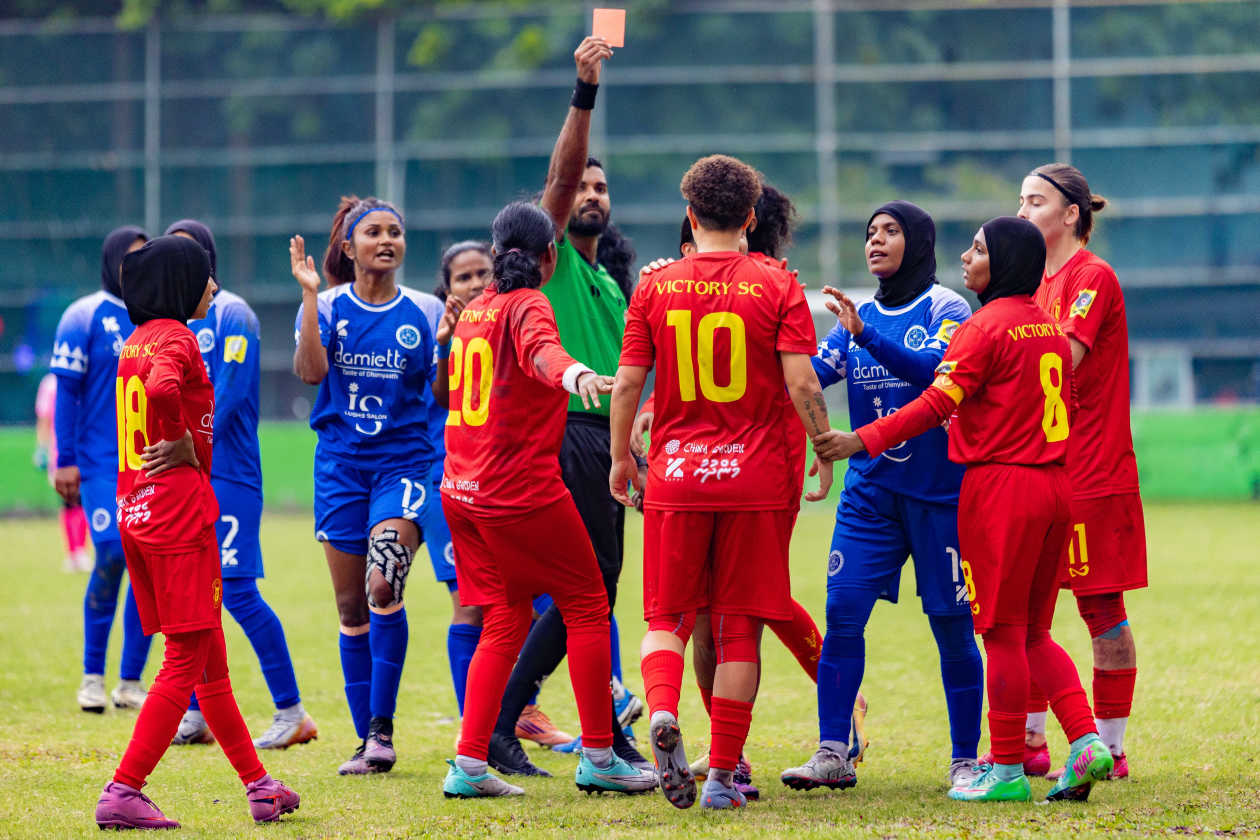 ވިކްޓަރީގެ ސަފީނާ އަށް ރަތް ކާޑު ދެއްކި ވަގުތު ދެ ޓީމުގެ ކުޅުންތެރިން މެޗުގެ ރެފްރީ ވަށާލައިގެން.--- ފޮޓޯ: އަދަދު ސްޕޯޓްސް / އިމޭޖަސް.އެމްވީ