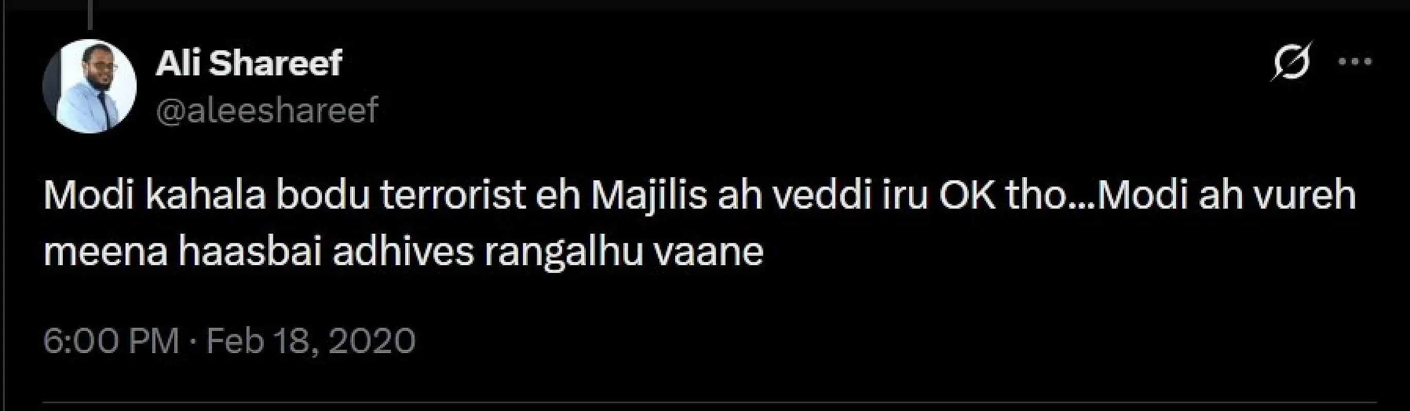 މީގެ އިތުރުން، އިންޑިއާގެ ބޮޑުވަޒީރު މޯދީއަކީ ޓެރަރިސްޓެއް ކަމަށް ސިފަަކޮށް ޕޯސްޓެއް ކުރައްވާފައިވާތީ މޯދީއަކީ ޓެރަރިސްޓެއް ކަމަށް އަދިވެސް ގަބޫލު ކުރައްވަންތޯ ސުވާލުކޮށް އެ ސުވާލަށް އިނގިރޭސި ބަހުން ޖަވާބު ދިނުމަށް ވެސް ނޫސްވެރިޔާ ވަނީ މިނިސްޓަރު އަރިހުން އެދިފަ އެވެ. އަދި އެކަމަށް މައާފަށް އެދުމުގެ ވިސްނުން ގެންގުޅުއްވަންތޯ ވެސް ނޫސްވެރިޔާ ސުވާލު ކުރި އެވެ.