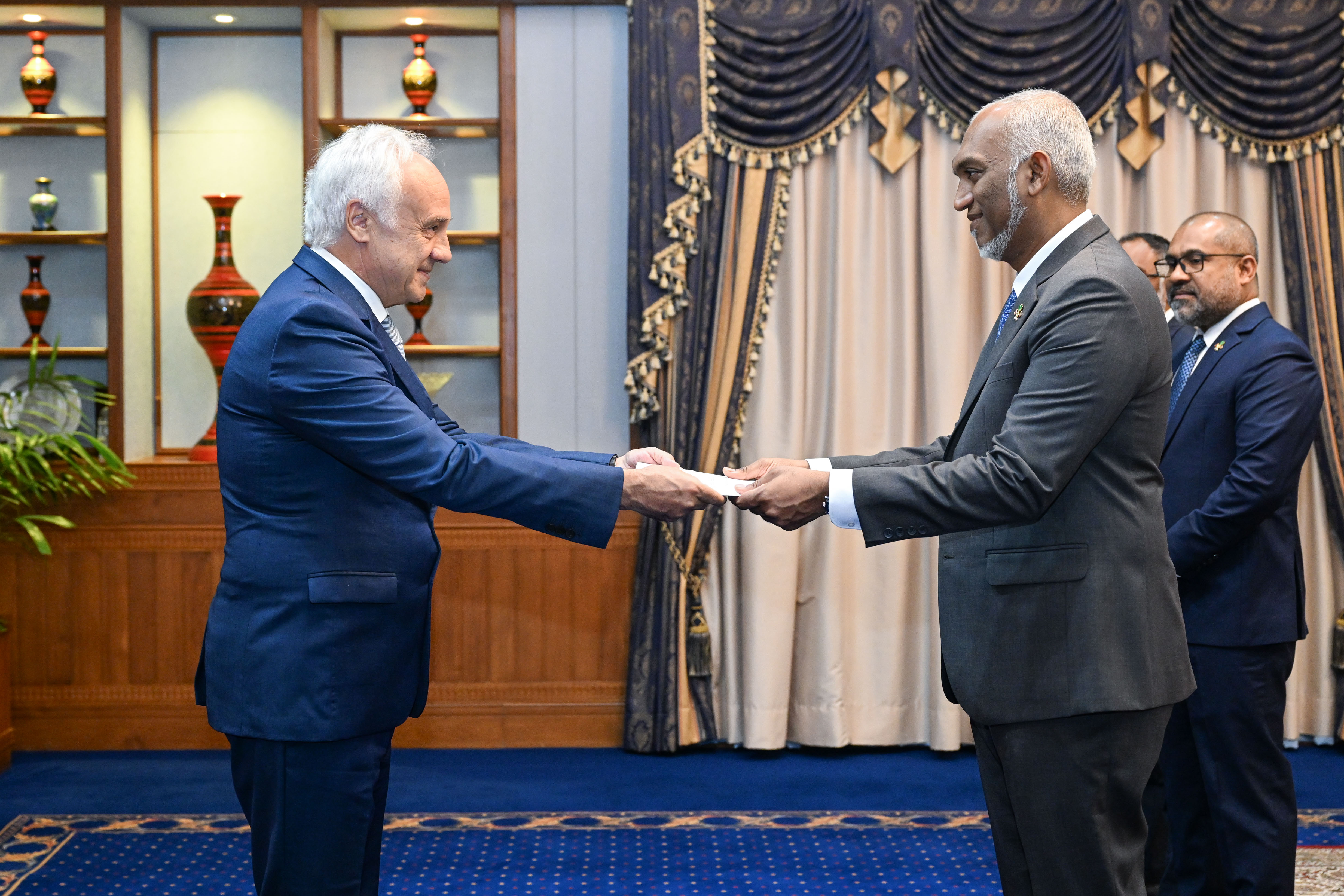 ކިންގްޑަމް އޮފް ސްޕެއިންގެ ސަރުކާރުން ދިވެހިރާއްޖެއަށް ކަނޑައެޅުއްވި އައު ނޮން-ރެޒިޑެންޓް ސަފީރު، ހިޒް އެކްސަލެންސީ ޚުއާން އެންޓޯނިއޯ މާރޗް ޕުޔޮލް، އެމަނިކުފާނުގެ ސަފީރުކަމުގެ ފަތްކޮޅު، ރައީސުލްޖުމްހޫރިއްޔާ ޑޮކްޓަރ މުޙައްމަދު މުޢިއްޒުއަށް އަރުވައިފިއެވެ. މި ރަސްމިއްޔާތު އޮތީ މިއަދު ހެނދުނު ރައީސުލްޖުމްހޫރިއްޔާގެ އޮފީހުގައެވެ.