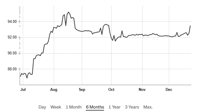 އަންނަ އަހަރު އަނބުރާ ދައްކަން ޖެހޭ ސުކޫކަށް އިންވެސްޓު ކުރި ފައިސާ އަނބުރާ ލިބޭނެ ކަމާ މެދު އިންވެސްޓަރުންގެ އޮތް ޔަގީންކަން ބޮޑުވެ، ސުކޫކުގެ އަގު މަޑުމަޑުން އިތުރުވަމުން އައިސް ޑޮލަރަކަށް 92 ސެންޓަށް ވުރެ މަތީގައި ހަމަޖެހިލައިފި އެވެ.