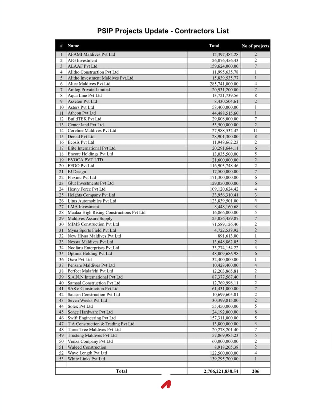 މިއަދު ބަހާލި 206 މަޝްރޫއުގެ ޖުމުލަ އަގަކީ 2.7 ބިލިއަން ރުފިޔާ އެވެ. އޭގެ ތެރެއިން ބޯހިޔާވަހިކަމާއި ބަނދަރު ތަރައްގީކުރުމުގެ 13 މަޝްރޫއުއަކަށް 997 މިލިއަން ރުފިޔާ އަރާއިރު، ތައުލީމީ ދާއިރާގެ 26 މަޝްރޫއު އަށް 397 މިލިއަން ރުފިޔާ، ސިއްހީ ދާއިރާގެ 30 މަޝްރޫއުއަކަށް 312 މިލިއަން ރުފިޔާ އަރަ އެވެ.