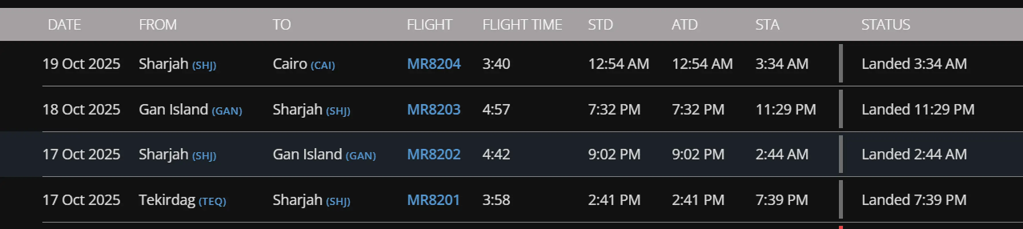 ފްލައިޓް ދަތުރުކޮށްފައިވާ ރޫޓަށް ބަލާއިރު އައްޑުއަށް ދަނީ ޔޫއޭއީގެ ޝަރްޖަހް ސިޓީންނެވެ. ޔޫއޭއީއަށް އެ ބޯޓު ދަނީ ތުރުކީންނެވެ. ތުރުކީގެ ތެކިރްދާގް ސިޓީންނެވެ.