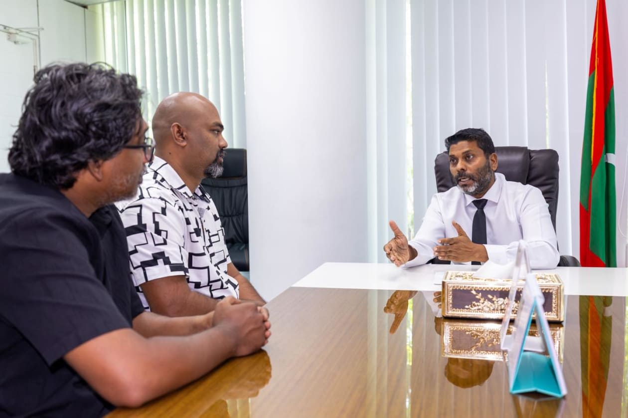 ގޯލްޑަން ފުޓްސަލް އެސޯސިއޭޝަންގެ ރައީސް ރިލްވާން މޫސާ އާއި ޖެނެރަލް ސެކްރެޓަރީ، އަހުމަދު ޝަހީމްއާ އެކު، މިނިސްޓަރު ރާފިއު ބޭއްވި ބައްދަލުވުމުގެ ތެރެއިން.--- ފޮޓޯ: ގޯލްޑަން ފުޓްސަލް އެސޯސިއޭޝަން