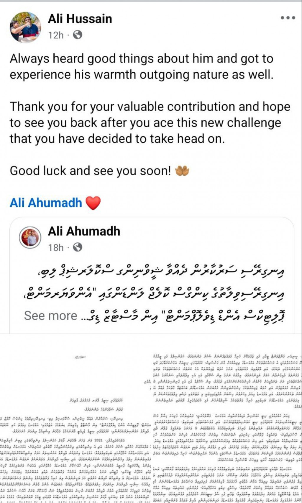އަލީ މަސައްކަތާ ގުޅޭ ގޮތުން ކައުންސިލްގެ މެންބަރު ރިލްވާން މުހައްމަދާއި އަހުމަދު އަބުދުﷲ އާއި އާތިފާ އަލީ އަދި އައިމިނަތު މަޖީދާ ވަނީ ޝުކުރުއަދާކުރައްވައި ކާމިޔާބަށް އެދިލައްވާ ޕޯސްޓް ލިޔުއްވާފަ އެވެ.