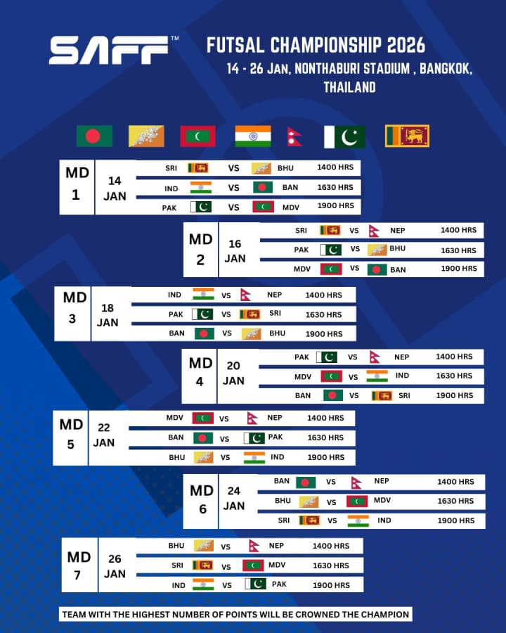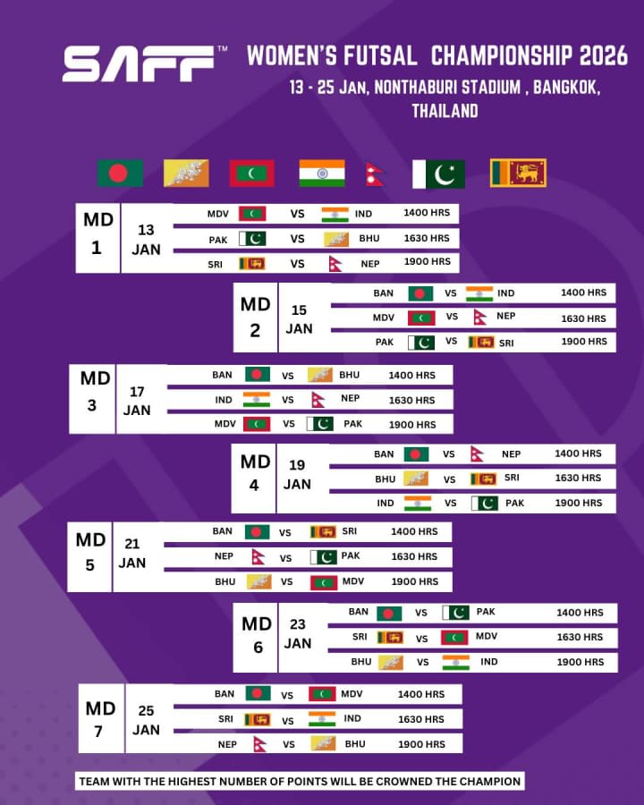 އެ ގޮތުން، ފިރިހެން ޑިވިޝަނުގެ މުބާރާތުގައި ރާއްޖޭން ކުޅޭ ފުރަތަަމަ މެޗުގައި ޖެނުއަރީ 14 ވަނަ ދުވަހު ޕާކިސްތާނާ ބައްދަލުކުރާނެ އެވެ. ދެ ވަަަނަ މެޗުގައި ޖެނުއަރީ 16 ވަނަ ދުވަހު ބަންގްލަދޭޝާ ކުޅުމަށް ފަހު، ތިން ވަނަ މެޗުގައި ޖެނުއަރީ 20 ވަނަ ދުވަހު، އިންޑިއާއާ ކުޅޭނެ އެވެ. އަދި، ހަތަރު ވަނަ މެޗުގައި ޖެނުއަރީ 22 ވަނަ ދުވަހު ނޭޕާލާ ކުޅުމަށް ފަހު، ފަސް ވަނަ މެޗުގައި ޖެނުއަރީ 24 ވަނަ ދުވަހު، ބޫޓާނާ ކުޅުމަށް ފަހު، މުބާރާތުގައި ރާއްޖޭން ފަހު މެޗުގައި، ޖެނުއަރީ 26 ވަަނަ ދުވަހު ބައްދަލުކުރާނީ، ސްރީ ލަންކާއާ އެވެ.