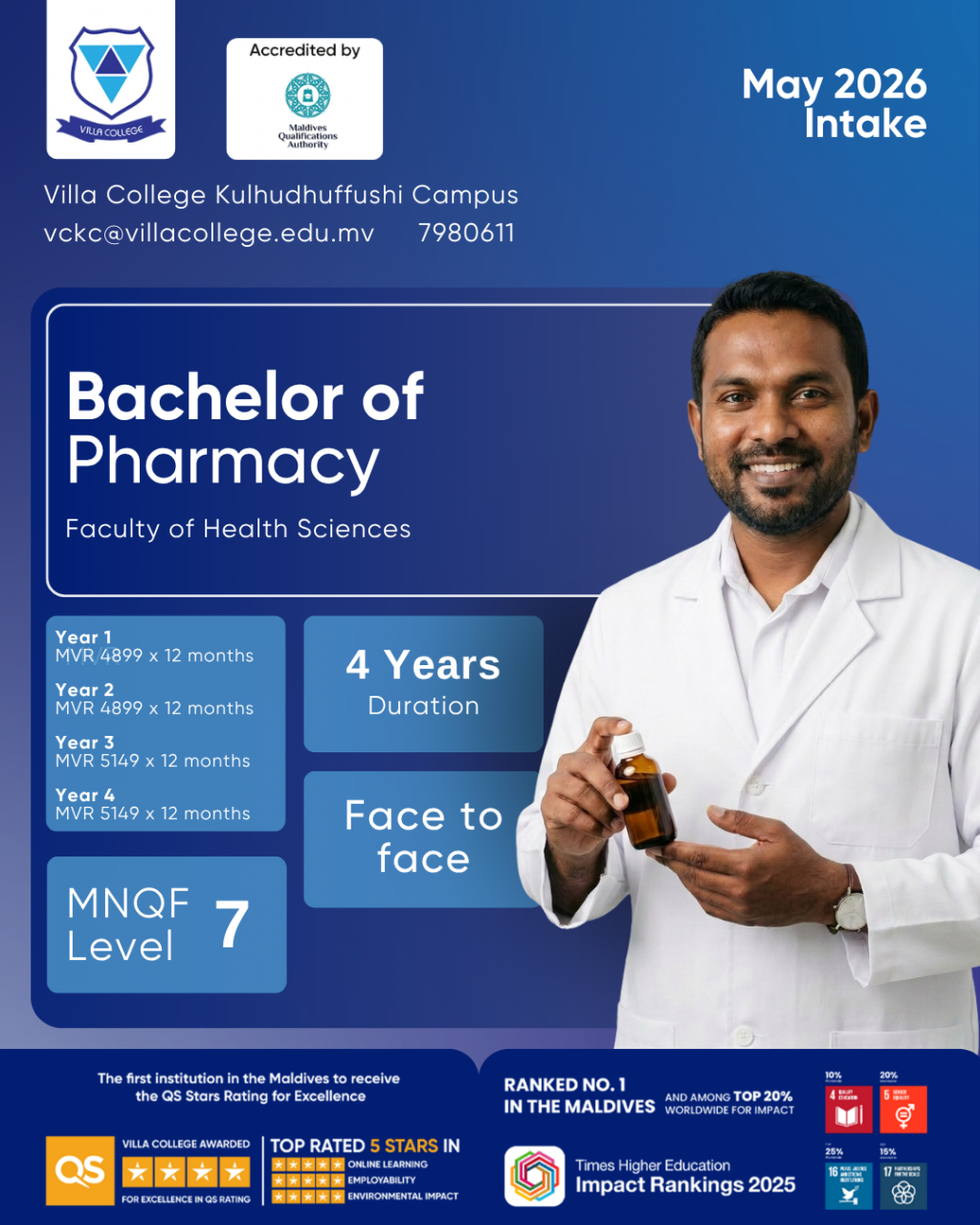 މޯލްޑިވްސް ކޮލިފިކޭޝަން އޮތޯރިޓީ އާއި އެލައިޑް ހެލްތު ކައުންސިލްގެ ރުހުމާއެކު، ވިލާކޮލެޖުގައި ބެޗެލާރ އޮފް ފާމަސީ ކޯސް، 2026 ވަނަ އަހަރުގެ މެއި އިންޓޭކުގައި ވަނީ އަލަށް ތައާރަފްކުރެވިފައެވެެ.