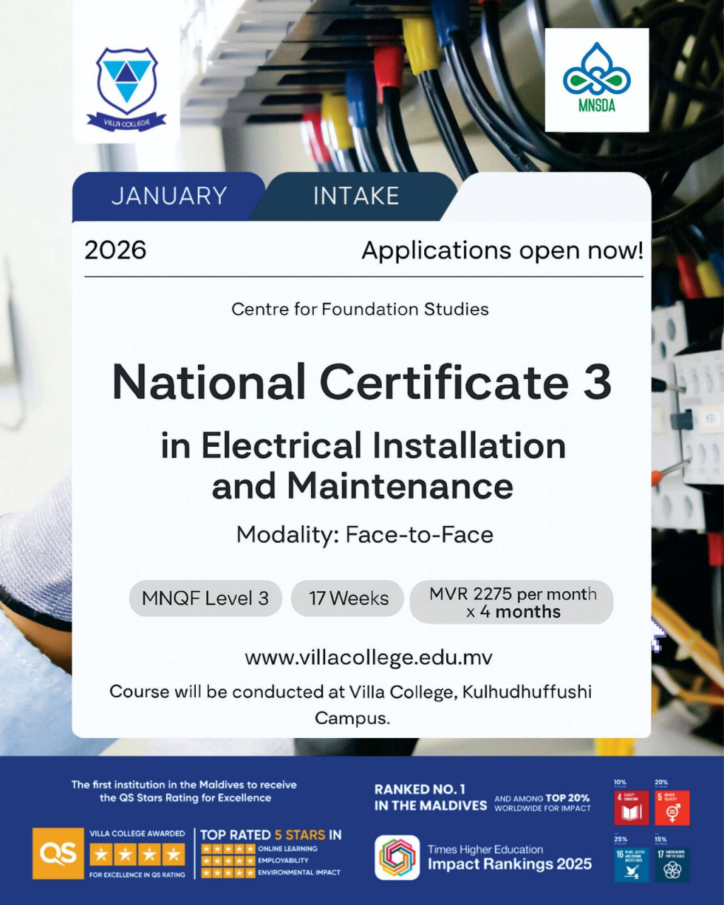 ކުރިއަށް އޮތް ޖެނުއަރީ އިންޓޭކުގައި، ވިލާކޮލެޖު ކުޅުދުއްފުށީ ކެމްޕަހުގައި ނޭޝަނަލް ސެޓްފިކެޓް 3 އިން އިލެކްޓްރިކަލް އިންސްޓޮލޭޝަން އެންޑް މެއިންޓަނެންސް ކިޔެވުމުގެ ފުރުސަތު ހުޅުވާލައިފި އެވެ.