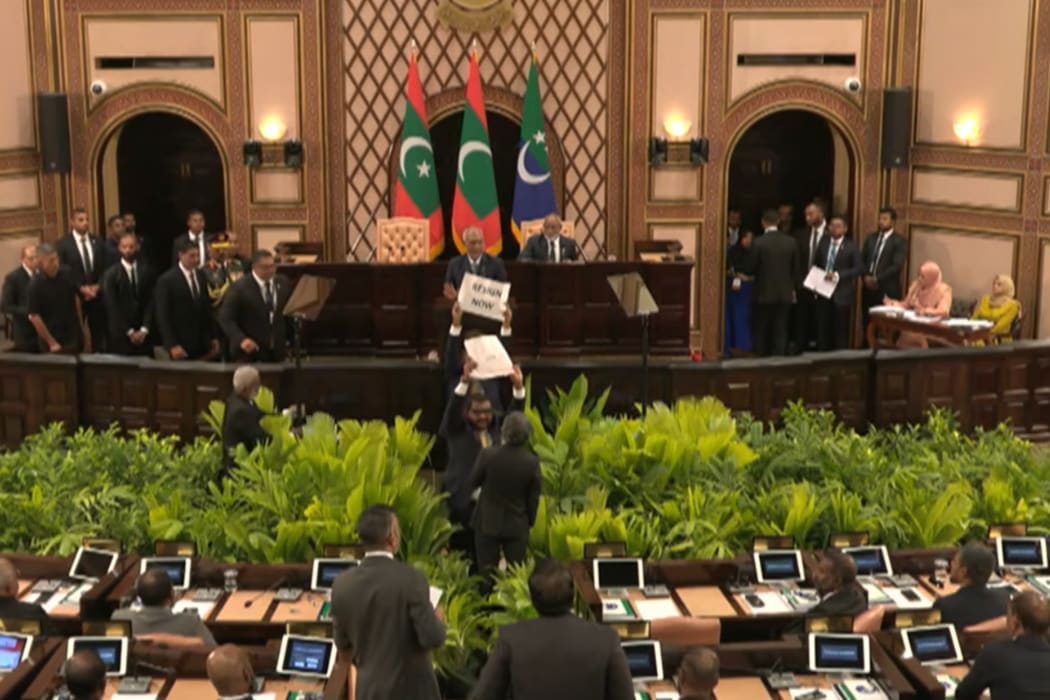 ރިޔާސީ ބަޔާން އިއްވި ވަގުތު ރައީސް މުހައްމަދު މުއިއްޒުގެ އިސްތިއުފާއަށް އިދިކޮޅު އެމްޑީޕީ މެންބަރުން ގޮވާލަމުން ދަނިކޮށް، ބައެއް މެންބަރުންގެ ނަން އިއްވައި ޖަލްސާއިން ބޭރުކޮށްލައިފި އެވެ.