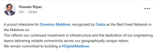 ދުނިޔޭގެ އެންމެ މަޤްބޫލް އިންޓަރނެޓްގެ ސްޕީޑް ޓެސްޓް ހިދުމަތް އޫކާލް އިން ހޮވި ދިވެހިރާއްޖޭގެ "ބެސްޓް ފިކްސްޑް ނެޓްވޯކް" ގެ އެވޯދް އުރީދޫ މޯލްޑިވްސްއަށް ވަނީ ލިބިފައެވެ.