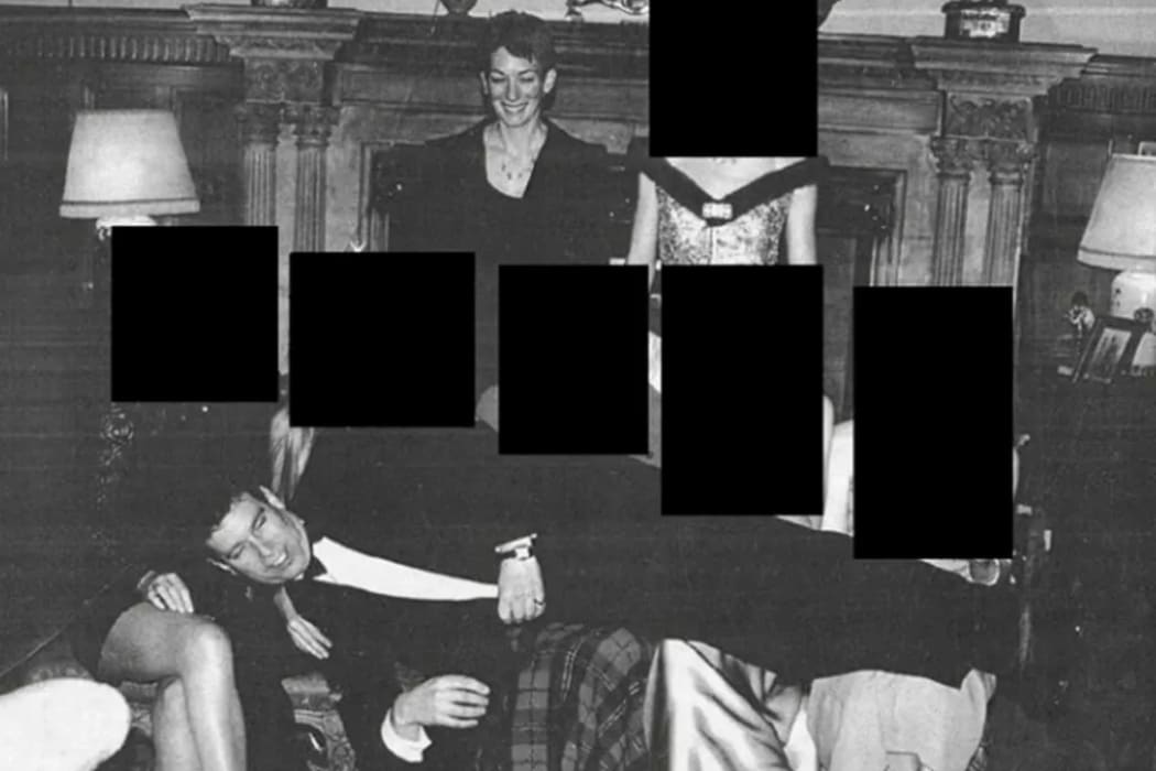 އޭނާގެ ފަހަތުގައި، ޖިންސީ ވަގުފާރީގެ ކުށް ސާބިތުވެ ޖަލަށްލާފައިވާ ގިލެއިން މެކްސްވެލް ހިނިތުންވެފައި އެންޑްރޫއަށް ބަލަހައްޓައިގެން ހުރެ އެވެ. ފޮޓޯގައި ހިމެނޭ އަންހެން ކުދިންގެ މޫނުތައް އެމެރިކާގެ ޖަސްޓިސް ޑިޕާޓްމެންޓުން އާންމުކުރީ އެ ކުދިންގެ މޫނު ނޭނގޭ ގޮތް ހަދާފަ އެވެ.