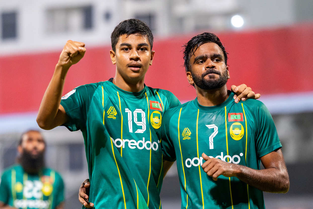 މާޒިޔާގެ ފުރަތަމަ ލަނޑު ޖެހި ޗޯޓު (ކ) އެ ލަނޑު ޖަހަން ފުރުސަތު ތަނަވަސްކޮށްދިން އިލާންއާ އެކު: މާޒިޔާ އިން މި މެޗުގައި ޖެހި ތިން ގޯލަށް ވެސް ފުރުސަތު ހޯދައިދިނީ އިލާން.---- ފޮޓޯ: އަދަދު ސްޕޯޓްސް / އިމޭޖަސް.އެމްވީ