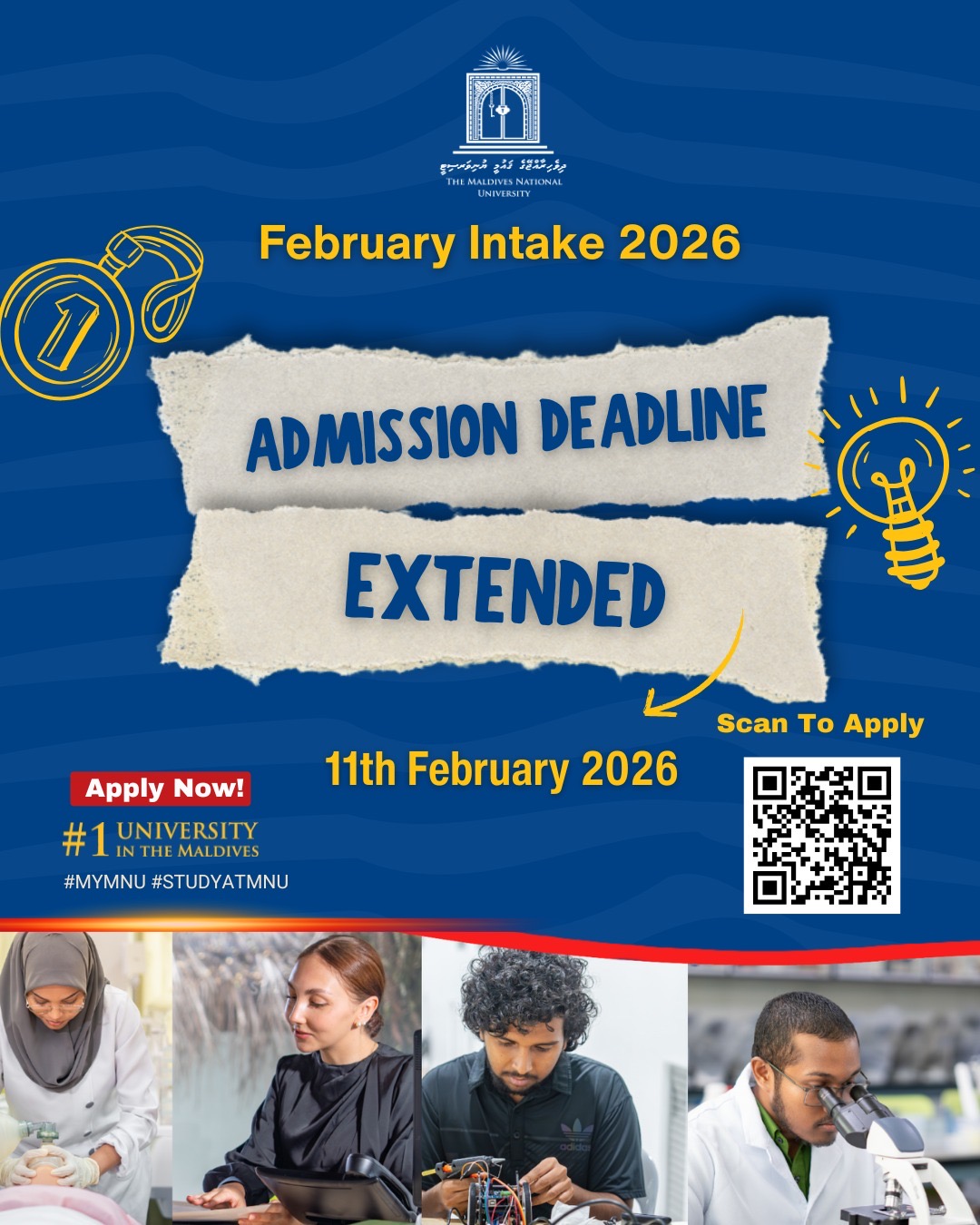 ދިވެހިރާއްޖޭގެ ޤައުމީ ޔުނިވަރސިޓީ (އެމްއެންޔޫ) އިން 2026 ވަނަ އަހަރުގެ ފެބްރުވަރީ މަހު ފެށުމަށް ހަމަޖެހިފައިވާ ކޯސްތަކުގެ ތެރެއިން ޖާގަ ހުރި ކޯސްތަކަށް ފޯމު ހުށަހެޅުމުގެ މުއްދަތު އިތުރުކޮށްފި އެވެ.