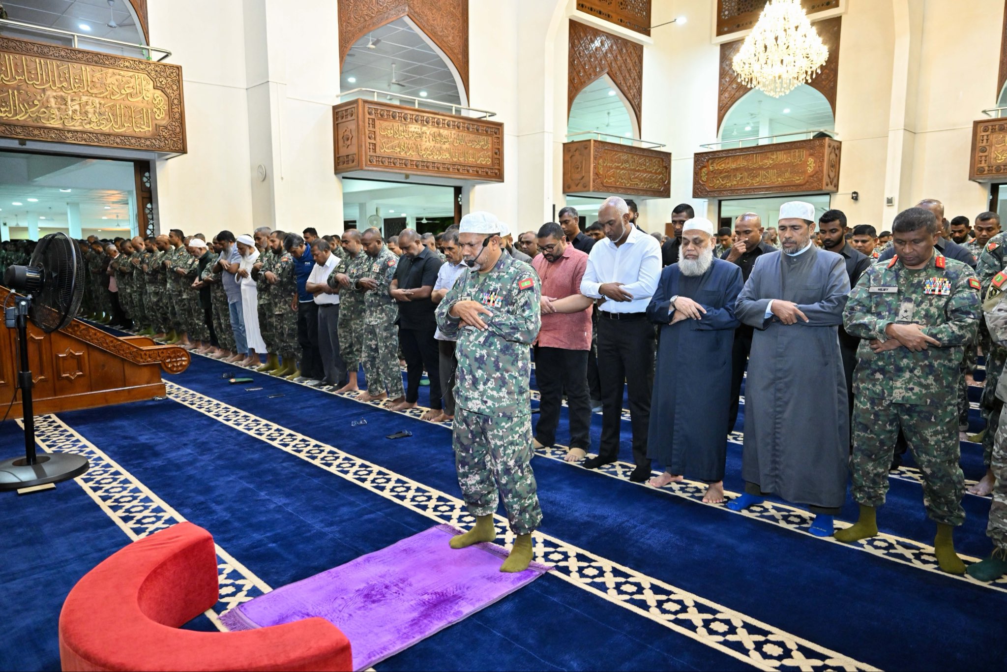 އިސްލާމީ މަރުކަޒުގައި ކުރި މި ފަތިސް ނަމާދުގައި ސިފައިންގެ އެންމެ މަތީ ވެރިޔާ، ރައީސް ޑރ. މުޙައްމަދު މުޢިއްޒު ބައިވެރިވެވަޑައިގެންނެވި އެވެ.