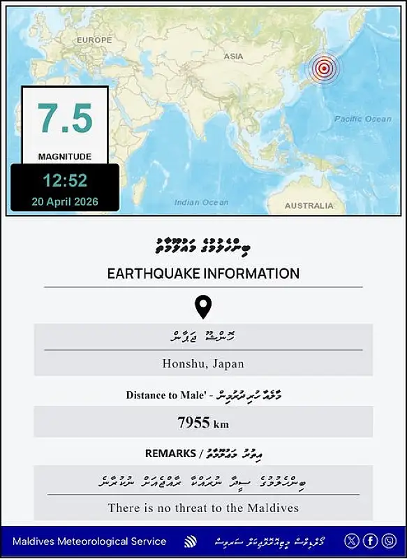 ވީ ކިހިނެއް؟ - މާލެއާ 7،955 ކިލޯމީޓަރު ދުރުން އައި މި ބިންހެލުމުގެ ސީދާ އަސަރު ރާއްޖެއަށް ނުކުރާނެ ކަމަށް، މޫސުމާ ބެހޭ ގައުމީ އިދާރާ (މެޓު އޮފީހުން) ވަނީ ބުނެފަ އެވެ.
