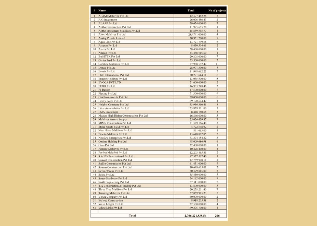 މާލިއްޔަތު ގަވާއިދު ބަދަލުކޮށް ބީލަމަކަށް ނުލައި 200 އަށް ވުރެ ގިނަ މަޝްރޫއު މިއަދު ހަވާލުކުރާ 53 ކުންފުންޏަކަކީ ކޮބައިކަމާއި އެ ކުންފުނިތަކާ ހަވާލުކުރާ މަޝްރޫއުތައް އަގުތައް އަދަދު އަށް އެނގިއްޖެ އެވެ.