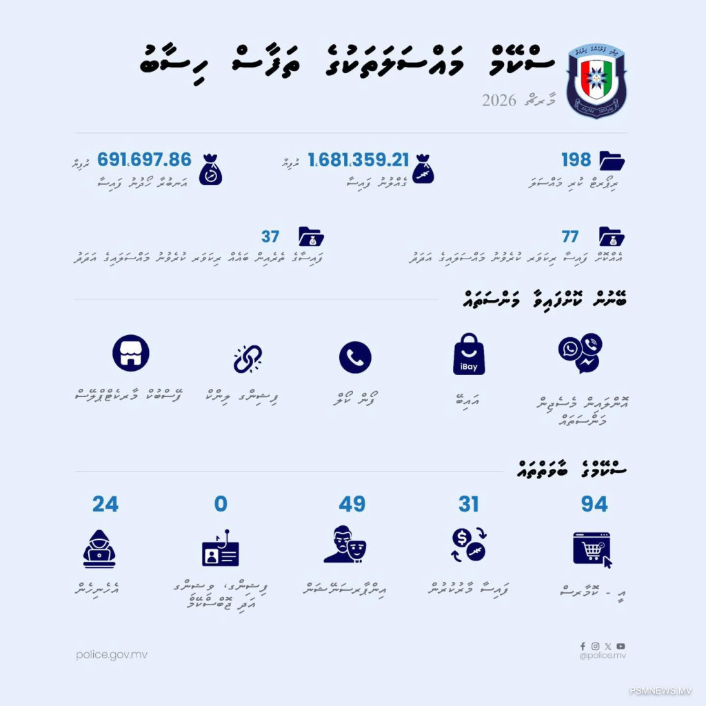 ފުލުހުންގެ އެންޓި ސްކޭމް ސެންޓަރުން ހިއްސާކޮށްފައިވާ ތަފާސްހިސާބުތަކުން ދައްކާ ގޮތުގައި ފާއިތުވި މަަސްތެރޭގައި ސްކޭމްގެ 198 މައްސަލައެއް ހުށައަޅާފައިވެއެވެ. އެ މައްސަލަތަކުގެ ތެރެއިން މުޅި ޖުމުލަ 1,681,359.21 (އެއްމިލިއަން ހަސަތޭކަ އަށްޑިހަ އެއްހާސް ތިންސަތޭކަ ފަންސާސް ނުވަ ރުފިޔާ އެކާވީސް ލާރި) ގެއްލިފައިވާ ކަމަށް ރިޕޯޓު ކޮށްފައިވެއެވެ. އޭގެތެރެއިން 691,697.86 ރުފިޔާ އަނބުރާ ހޯދާފައިވާ ކަމަށް އެ އިދާރާގެ ތަފާސްހިސާބުތަކުން ދައްކައެވެ.